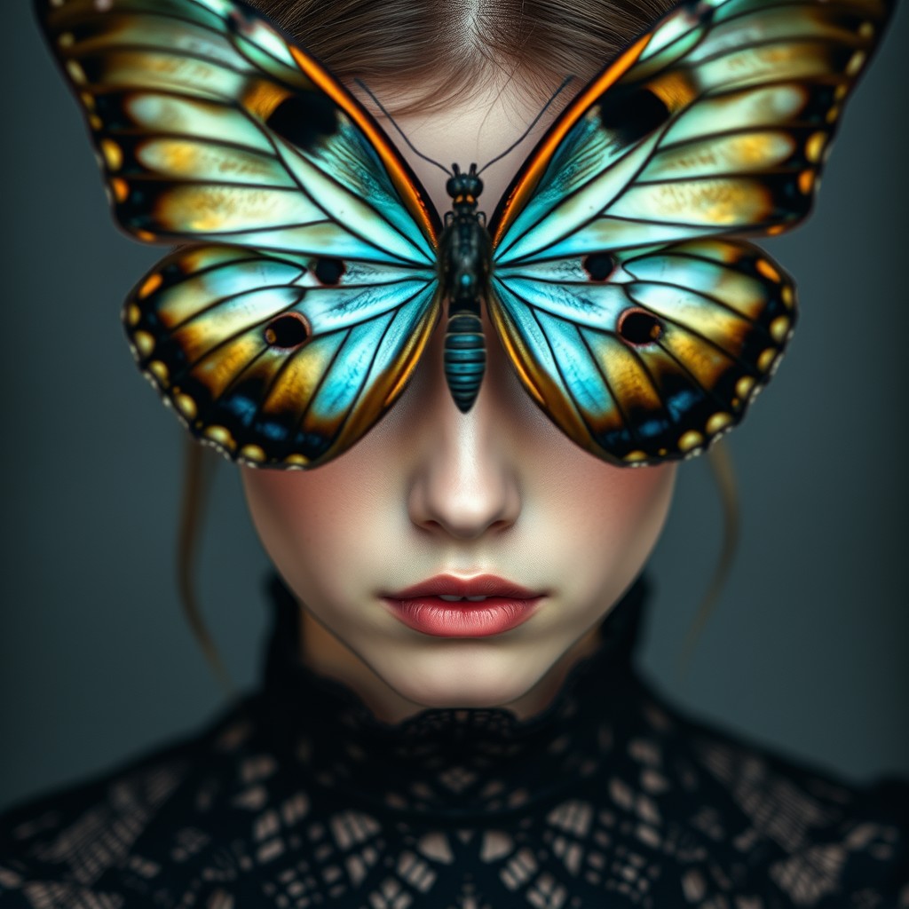 (close-up,girl in black high-collar lace blouse,enormous butterfly in front of face,butterfly wings covering eyes completely,(extremely detailed eyes and face),mysterious expression,(beautiful detailed eyes peering through),lace fabric texture,((best quality,4k,8k,highres,masterpiece:1.2)),ultra-detailed,(realistic,photorealistic,photo-realistic:1.37),HDR,UHD,studio lighting,vivid colors,bokeh,portrait,fantasy,delicate butterfly wings,intricate lace pattern,((butterfly and girl interaction)),((butterfly's wings)),((girl's serene face)),((black lace elegance)),((butterfly's iridescent colors)),((soft focus background)),((girl's poised posture)),((nature and fashion blend))