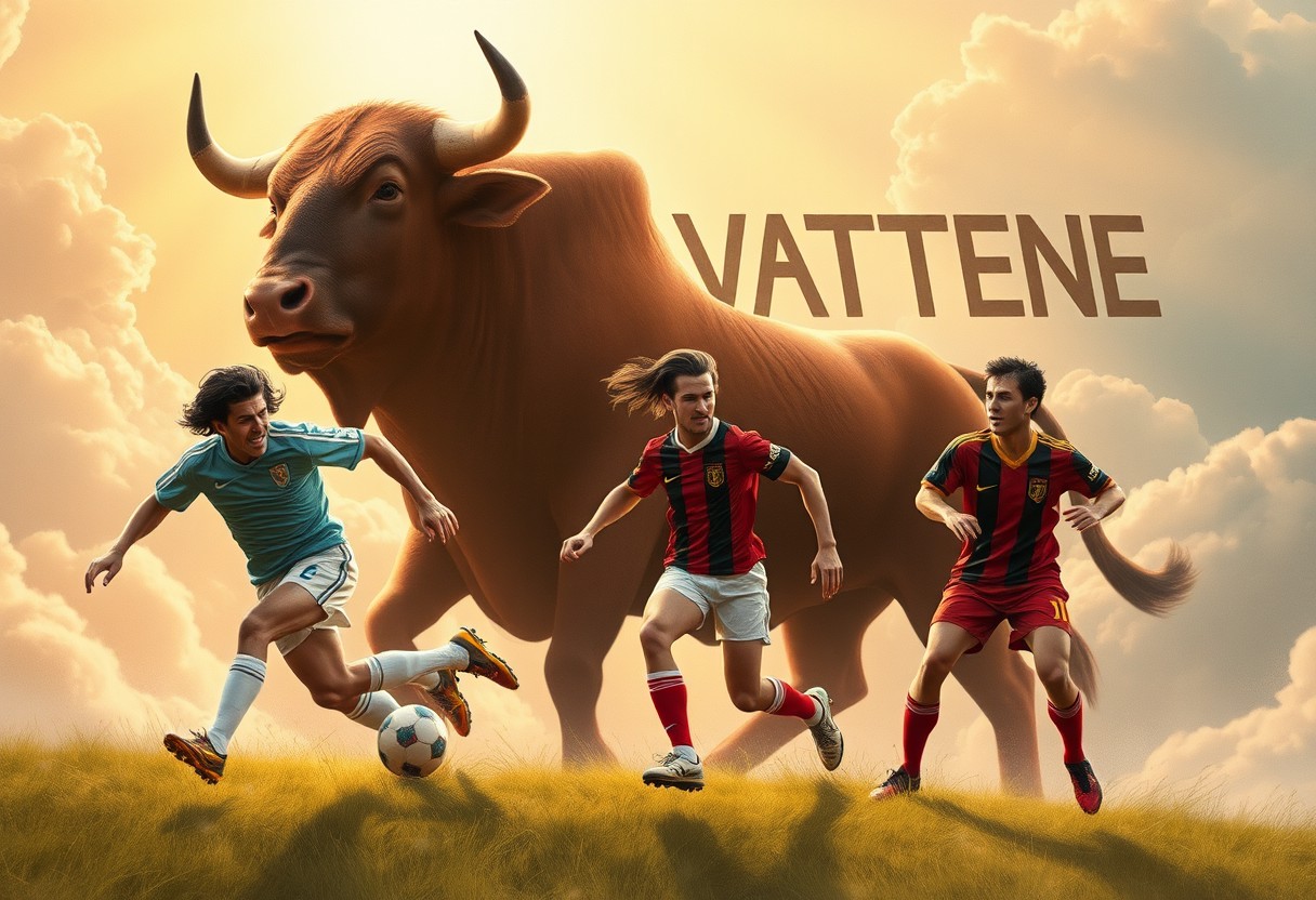 In a radiant heavenly setting, with soft clouds glowing in golden light, three soccer legends—Diego Armando Maradona, Gigi Meroni, and Valentino Mazzola—are playing soccer with joy and intensity. Maradona, wearing his iconic Argentine jersey, dribbles the ball skillfully, while Meroni, in his classic Torino kit, and Mazzola, in his vintage Torino uniform, move with grace and precision. Behind them, a massive, burgundy-colored bull snorts furiously, its nostrils flaring with power. In the background, a large, ornate cardboard sign reads ‘CAIRO VATTENE’ in bold letters, adding a touch of protest and defiance to the celestial scene. The mix of legendary players, the raging bull, and the rebellious sign create a moment filled with emotion, sportsmanship, and passion.