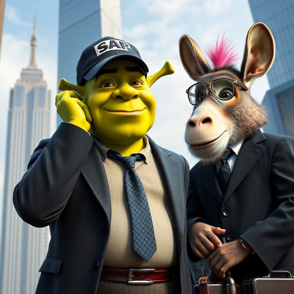 realistic businessman Mr. Shrek in SAP cap staying hear the tall building like Empire state building and straightens his tie looking forward in his other hand is a suitcase with a little Serbian red blue white flag on it, he is a realy cool guy. Next to him stands the second businessman Mr. Donkey with clear aviator glasses and pink under cut hairstyle, he is wearing a black suit and holding a vape in his hand next to them stands a cool little monkey in business suit also in glasses and has a beard