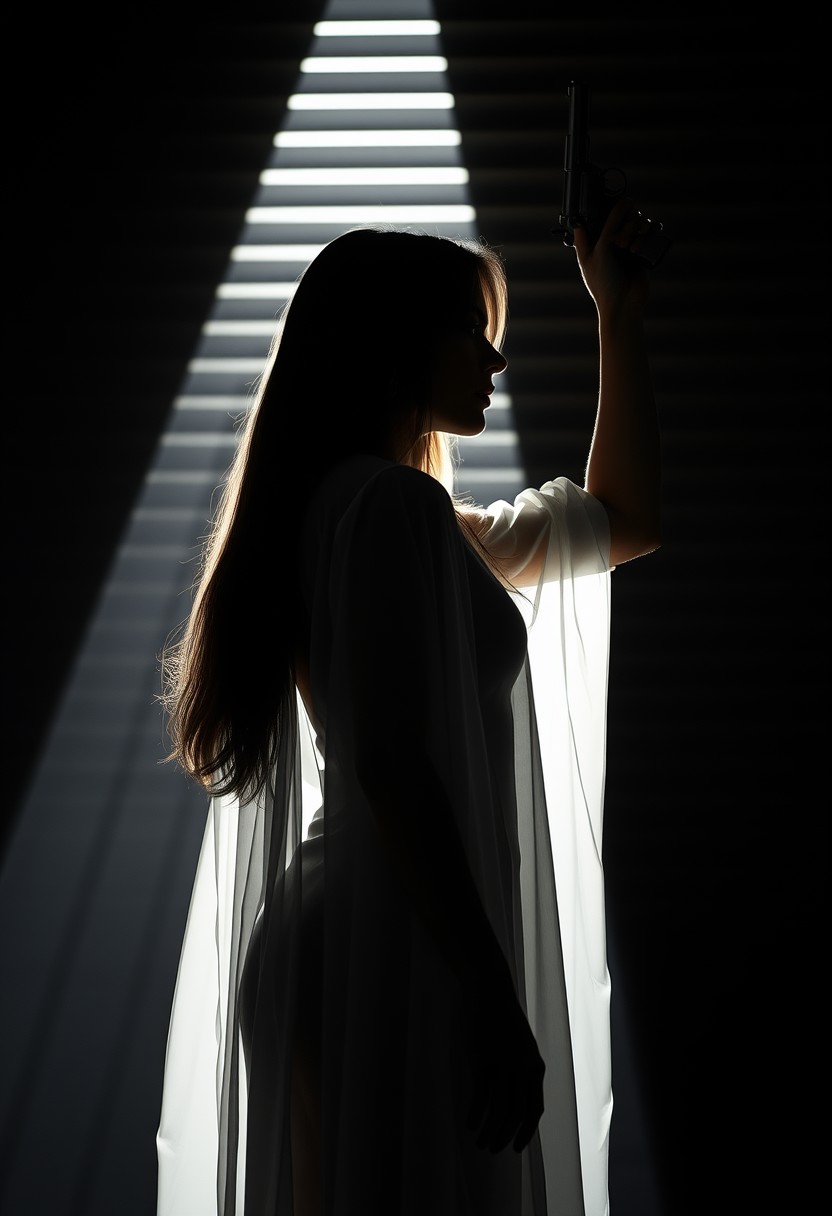 The composition features a stylized, high-contrast design typical of film noir. In the foreground, there is a figure of a woman standing in profile view. She has long hair and is wearing a white garment that appears to be sheer, as it reveals the backlit silhouette of her body underneath. She wears red lipstick. Her right arm is raised, holding a revolver with the barrel pointed upwards. The background consists of shades of black and grey and venetian blinds that create a dramatic high-contrast light effects, adding to the atmosphere of the ultra high detailed photo. Perfect composition, award-winning masterpiece.