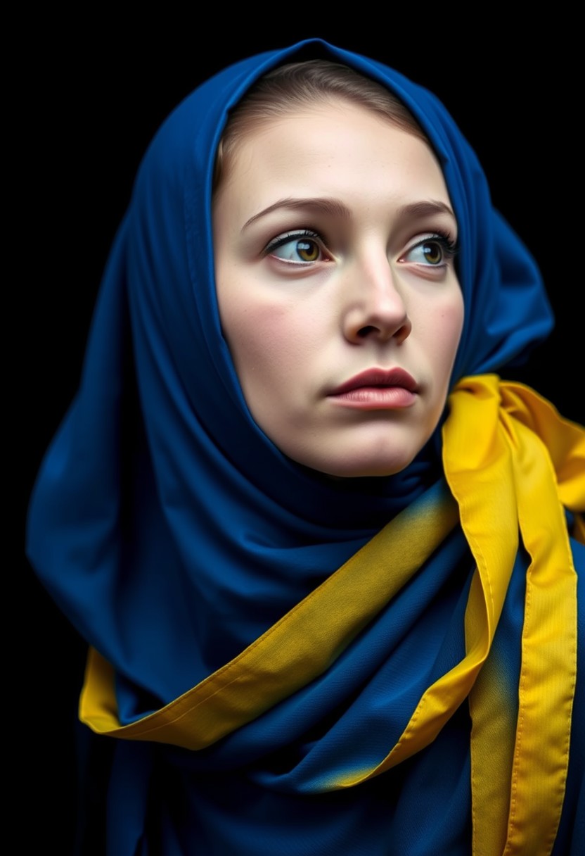 The photo is a portrait of a young woman. She is wearing a blue headscarf with a yellow ribbon tied around it, covering her head and neck. The woman is looking off to the side with a serious expression on her face. She has a pale complexion and her hair is pulled back in a neat bun. The background is dark, making the woman's face the focal point of the photo. vibrant colors. The overall mood of the image is somber and contemplative.