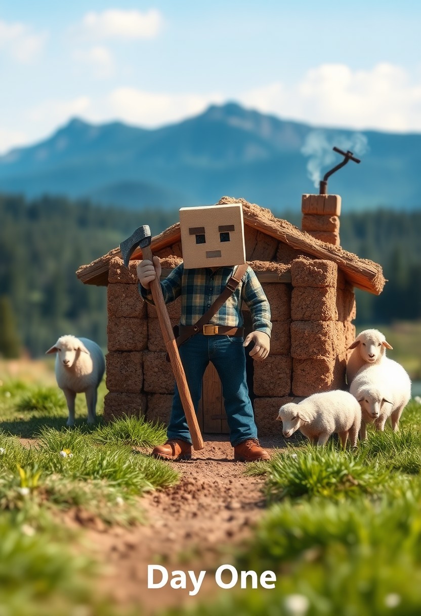 Hyper-realistic photograph. In the background we see a distant forested mountain range under a blue sky. The main subject of the photograph is a man standing in the middle holding a wooden pick axe. This man has a square head and a square body, he is real but looks like a videogame character. He stands in front of a simple dirt house made of square dirt blocks with a wooden plank door and a smoking chimney. On the side of the house a small group of fluffy white sheep graze in the grass, they too are square, a square head and square body. Text at the bottom of the image reads "Day One"