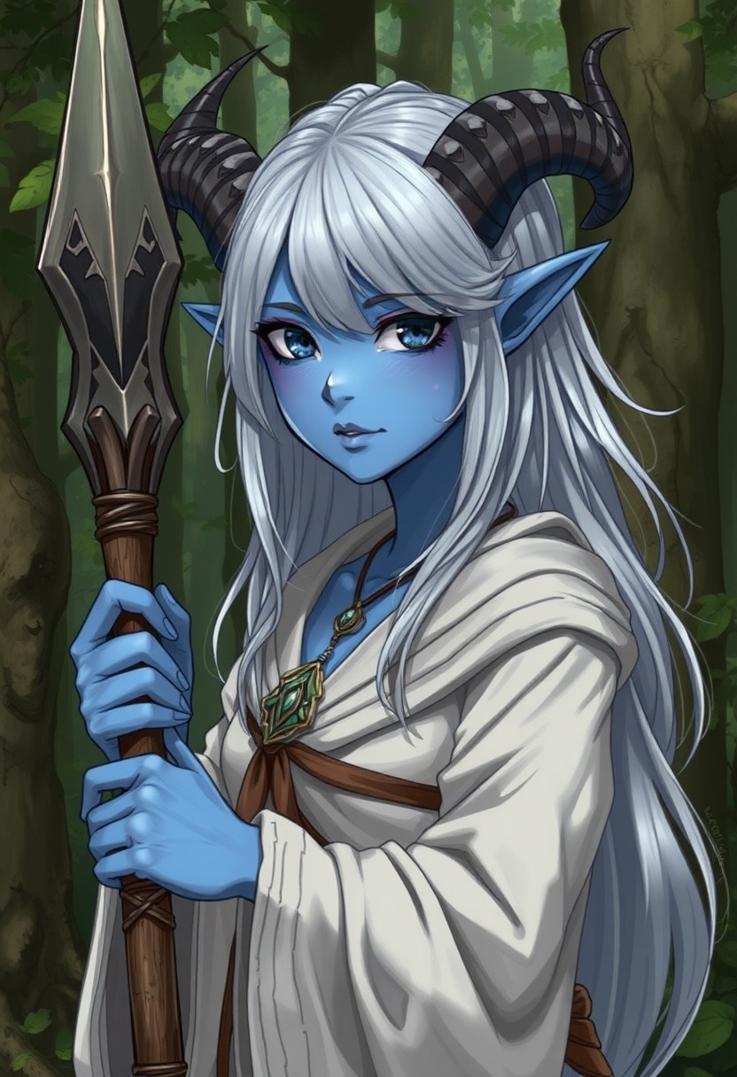 detailed anime style, female tiefling, blue skin, white sclera, no iris, blank eyes, druid clothing, forest environment, holding druid staff