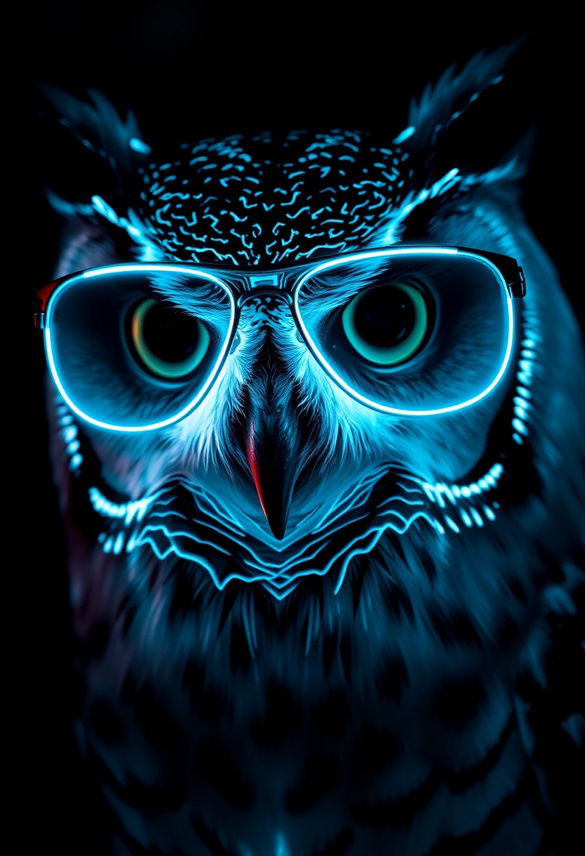 In a mesmerizing, hyper-realistic image, an owl's face is rendered in exquisite detail, with glow-in-the-dark face paint applied in a sleek, geometric pattern. The owl wears large, glowing aviator shades, their frames and lenses radiating a bright, electric blue light that complements the soft, ethereal glow of the face paint. The owl's eyes seem to gleam with a wise, knowing intensity, as if it's gazing into the very soul of the viewer. The glow-in-the-dark paint and shades are rendered in precise, photorealistic detail, with subtle texture and shading that creates a sense of depth and dimensionality. The surrounding darkness is pitch black, making the glowing paint and shades seem even more vibrant and hypnotic, as if the owl is radiating a mystical, otherworldly energy. Highest-Quality, 4k, intricate details, visually stunning, Masterpiece