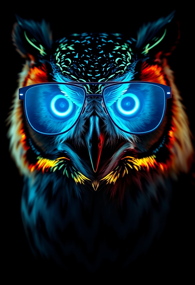 In a mesmerizing, hyper-realistic image, an owl's face is rendered in exquisite detail, with glow-in-the-dark face paint applied in a sleek, geometric pattern. The owl wears large, glowing aviator shades, their frames and lenses radiating a bright, electric blue light that complements the soft, ethereal glow of the face paint. The owl's eyes seem to gleam with a wise, knowing intensity, as if it's gazing into the very soul of the viewer. The glow-in-the-dark paint and shades are rendered in precise, photorealistic detail, with subtle texture and shading that creates a sense of depth and dimensionality. The surrounding darkness is pitch black, making the glowing paint and shades seem even more vibrant and hypnotic, as if the owl is radiating a mystical, otherworldly energy. Highest-Quality, 4k, intricate details, visually stunning, Masterpiece