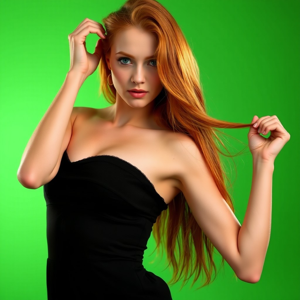 a beautiful ginger girl in erotic pose, small black dress,chroma green background