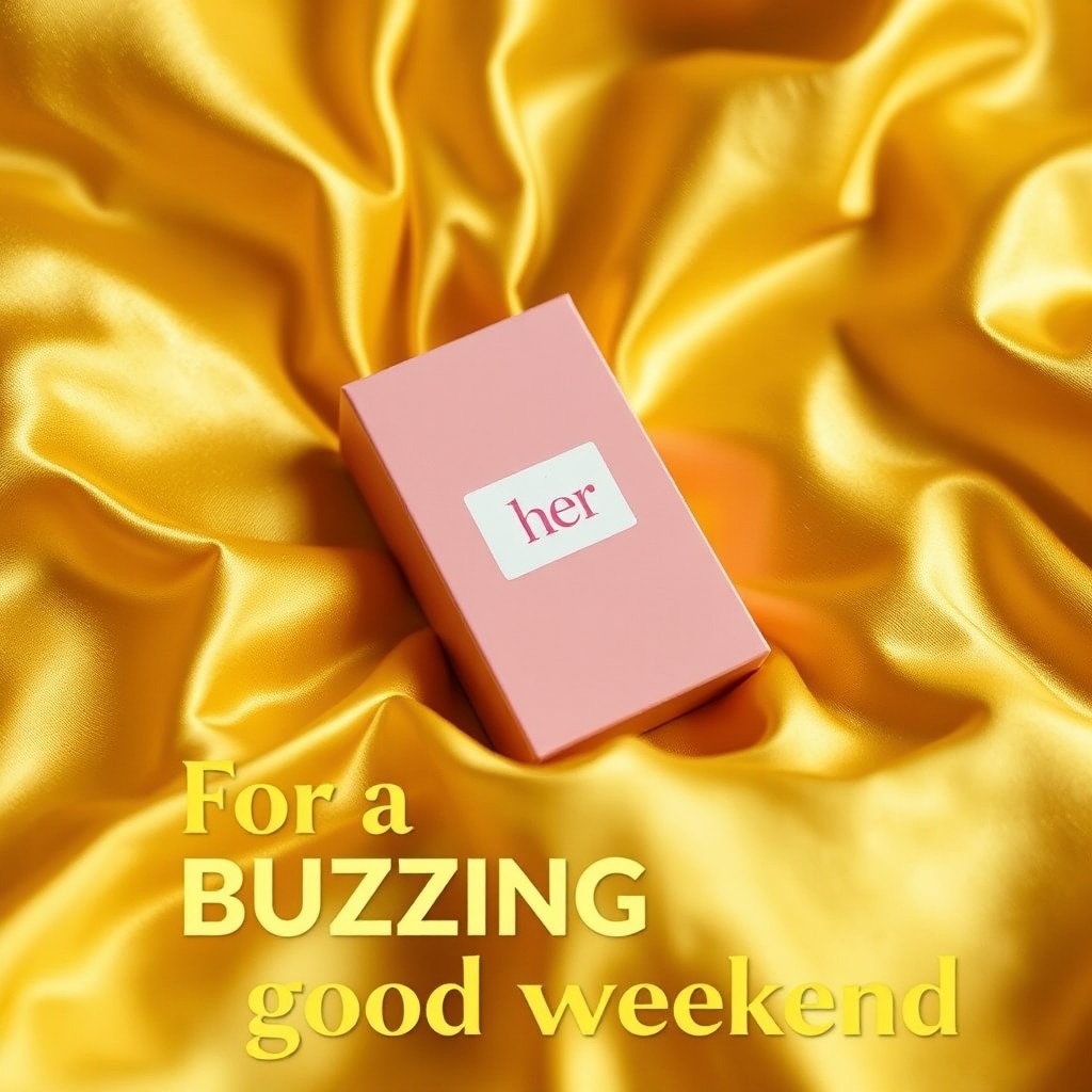 Advertisement product shot, a discrete slim rectangle pink box with a white label "her" lying on bright golden silken sheets. A colourful and inviting advertisement text jn cyan and gold: "For a BUZZing good weekend"