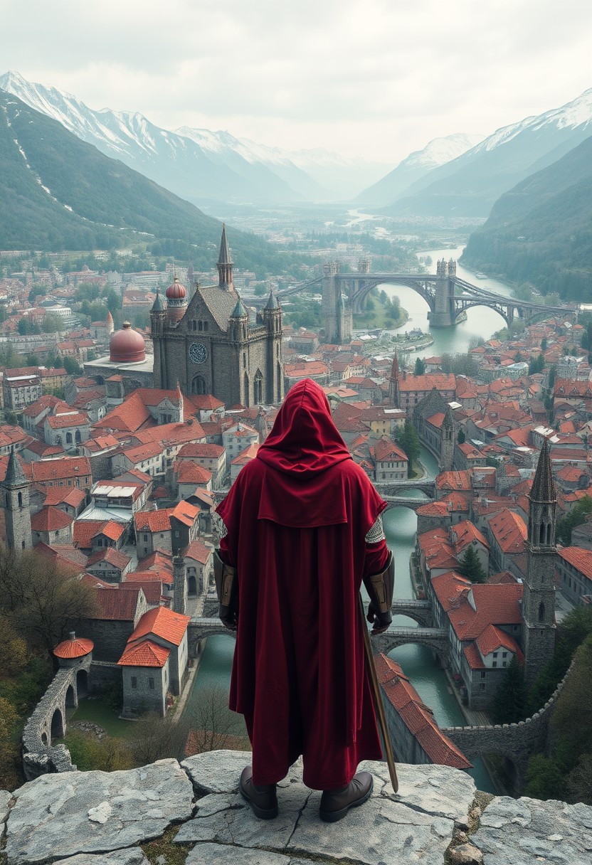 High quality high resolution digital photograph depicting a medieval cityscape from an elevated viewpoint. The layout features a sprawling city with intricate stone buildings, towers, and bridges, nestled in a lush, mountainous landscape. The subject is a lone figure with their back to the viewer, wearing a detailed, red hooded cloak and medieval armor, standing on a stone ledge overlooking the city. The city is characterized by its dense architecture, with red-tiled roofs, narrow streets, and a prominent castle with multiple towers. In the background, snow-capped mountains and a river winding through the valley add depth to the scene. The overall color palette includes earthy tones, greens, and grays, with the red cloak providing a striking contrast.