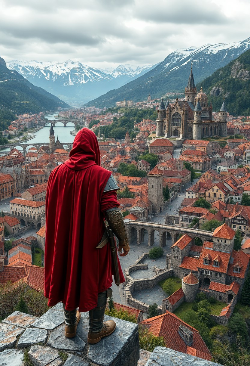 High quality high resolution digital photograph depicting a medieval cityscape from an elevated viewpoint. The layout features a sprawling city with intricate stone buildings, towers, and bridges, nestled in a lush, mountainous landscape. The subject is a lone figure with their back to the viewer, wearing a detailed, red hooded cloak and medieval armor, standing on a stone ledge overlooking the city. The city is characterized by its dense architecture, with red-tiled roofs, narrow streets, and a prominent castle with multiple towers. In the background, snow-capped mountains and a river winding through the valley add depth to the scene. The overall color palette includes earthy tones, greens, and grays, with the red cloak providing a striking contrast.