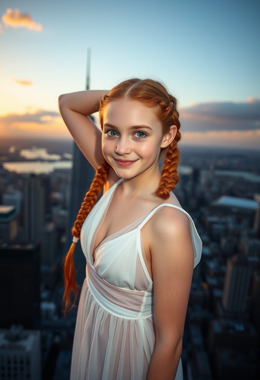A 20 year old irish girl with ginger braided hair is standing on top of a skyscraper with the sun setting in the background. Her silhouette is contrasted against the skyline. She is wearing a white see-through gown. She has large enchanting green eyes. She has a cute freckled face and blushing cheeks. Her smile is warm and welcoming. She has one arm raised, the other is resting on her hip. The photograph is taken with an analog machine, producing film grain effects. Photorealistic, HDR,