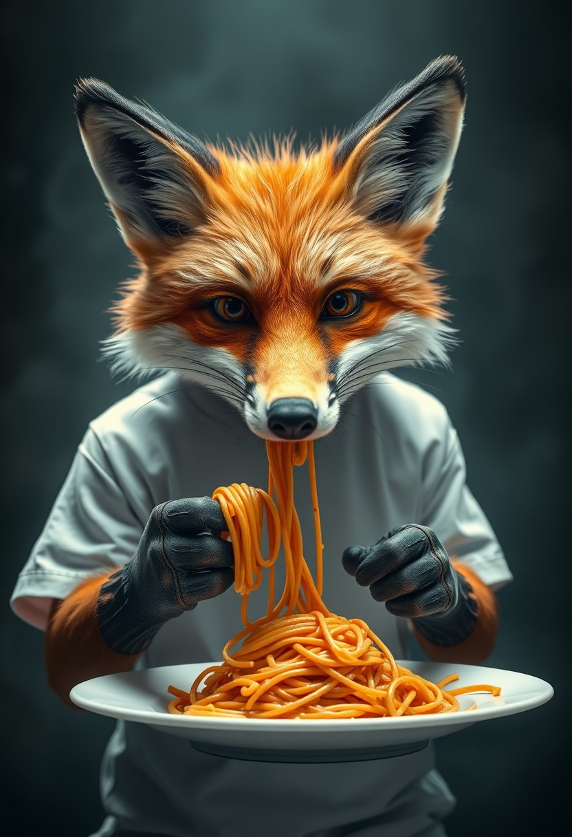 An anthro fox wearing a white t-shirt is eating spaghetti., cinematic, dramatic, dynamic, vibrant, atmospheric, funny