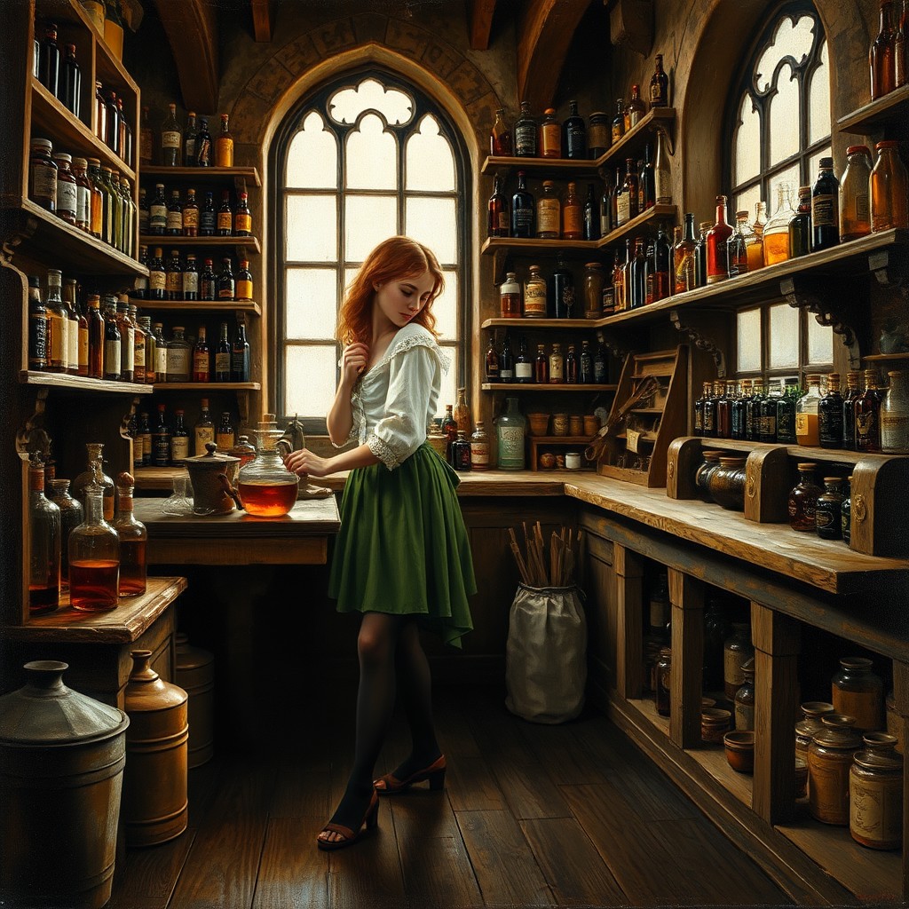 a masterful oil painting in the style of Rembrandt. a medieval apothecary shop, a woman with chestnut hair is wearing a short green skirt, white blouse and black hose with medieval leather sandals, she is mixing a potion at a workbench. Shelves full of exotic, brightly coloured jars and bottles line the wall. The wooden floor is black with age. A large window at brightly illuminates the scene.