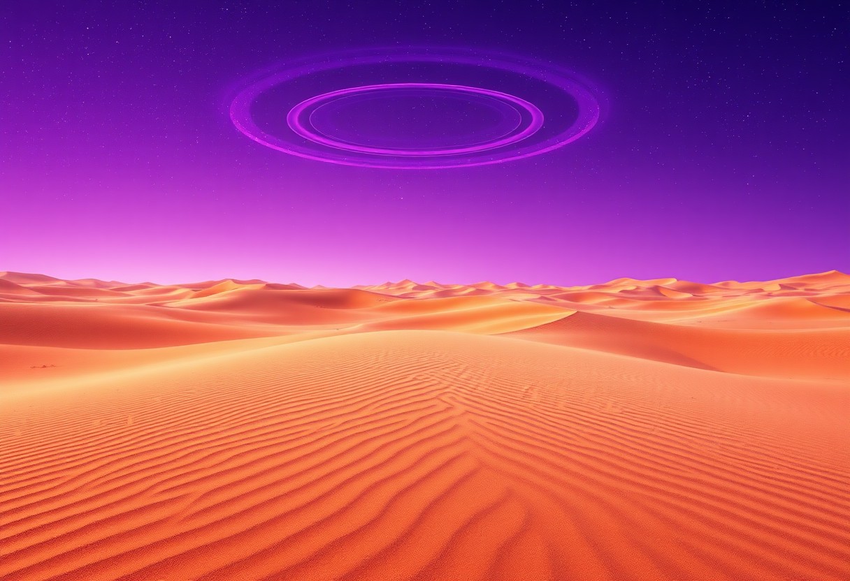 Endless deserts of glowing sand stretch beneath rings that shimmer in a violet sky, wallpaper, masterpiece