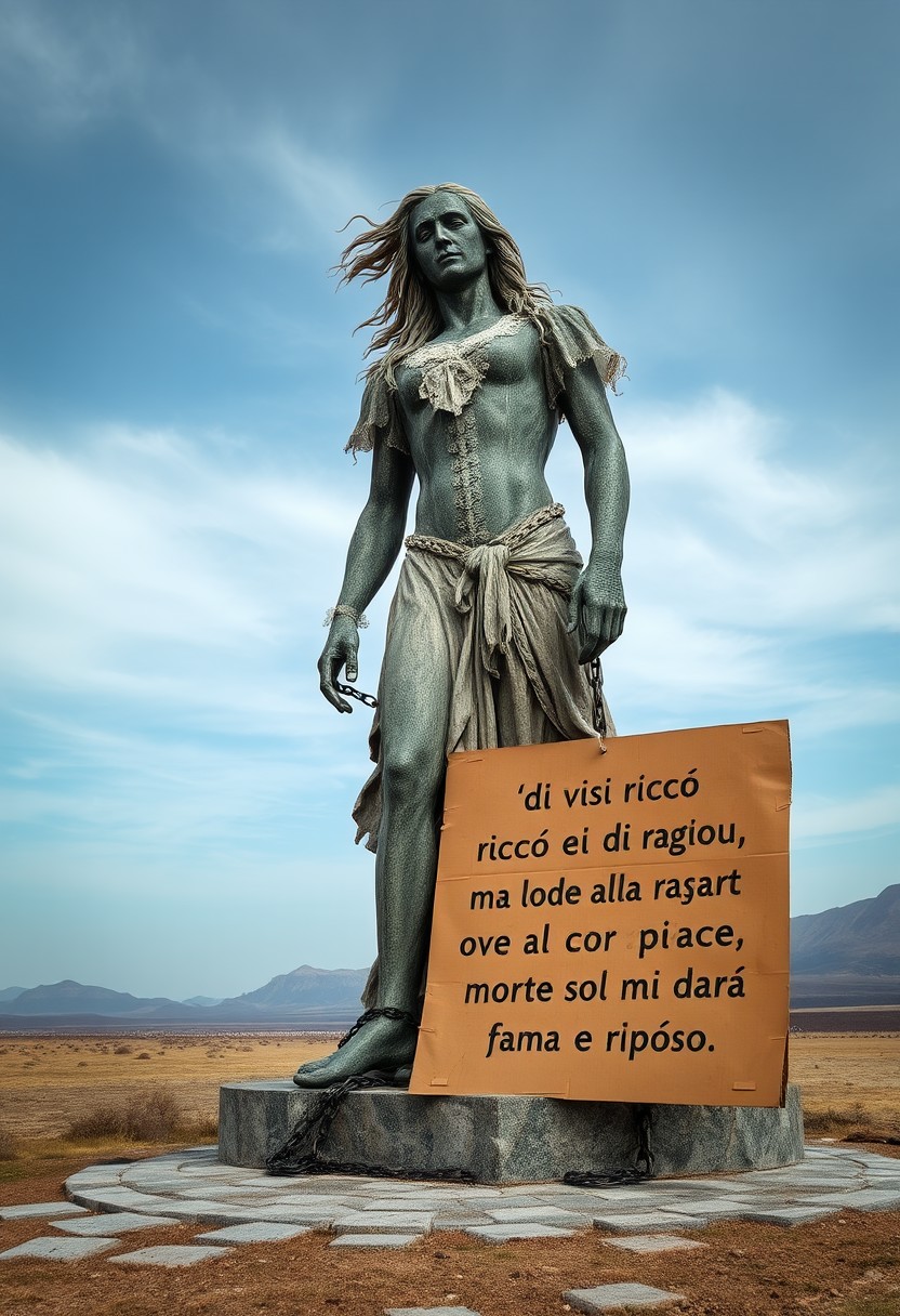 A massive, weathered statue stands in the center of a vast, desolate landscape. The figure is half man, half woman, with a striking duality of masculine and feminine features, their body torn and rattling from the pain of a broken soul. They wear an elaborate 1700s costume, detailed with fine embroidery and lace, now tattered and worn, as if eroded by time. Long, flowing hair cascades down their shoulders, wild and unkempt, adding to the sense of internal turmoil. Their feet are chained to the ground, locked to the floor of stone, preventing any movement, symbolizing imprisonment. The statue’s expression is one of deep suffering, their eyes filled with sorrow, as if trapped between worlds. A large, worn cardboard sign rests against the base of the statue, reading in bold letters: ‘di vizi ricco e di virtù, do lode alla ragion, ma corro ove al cor piace: morte sol mi darà fama e riposo.’ The wind blows softly, causing the cardboard to flutter slightly, adding a feeling of fragility and despair to the scene. The landscape around is barren and bleak, reflecting the inner desolation of the figure, as they await a release that only death can bring