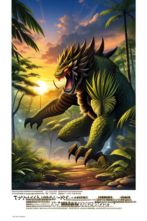 a big ferocious Japanese kaju, jungle, sunset, illustration in the style of ASstyle001