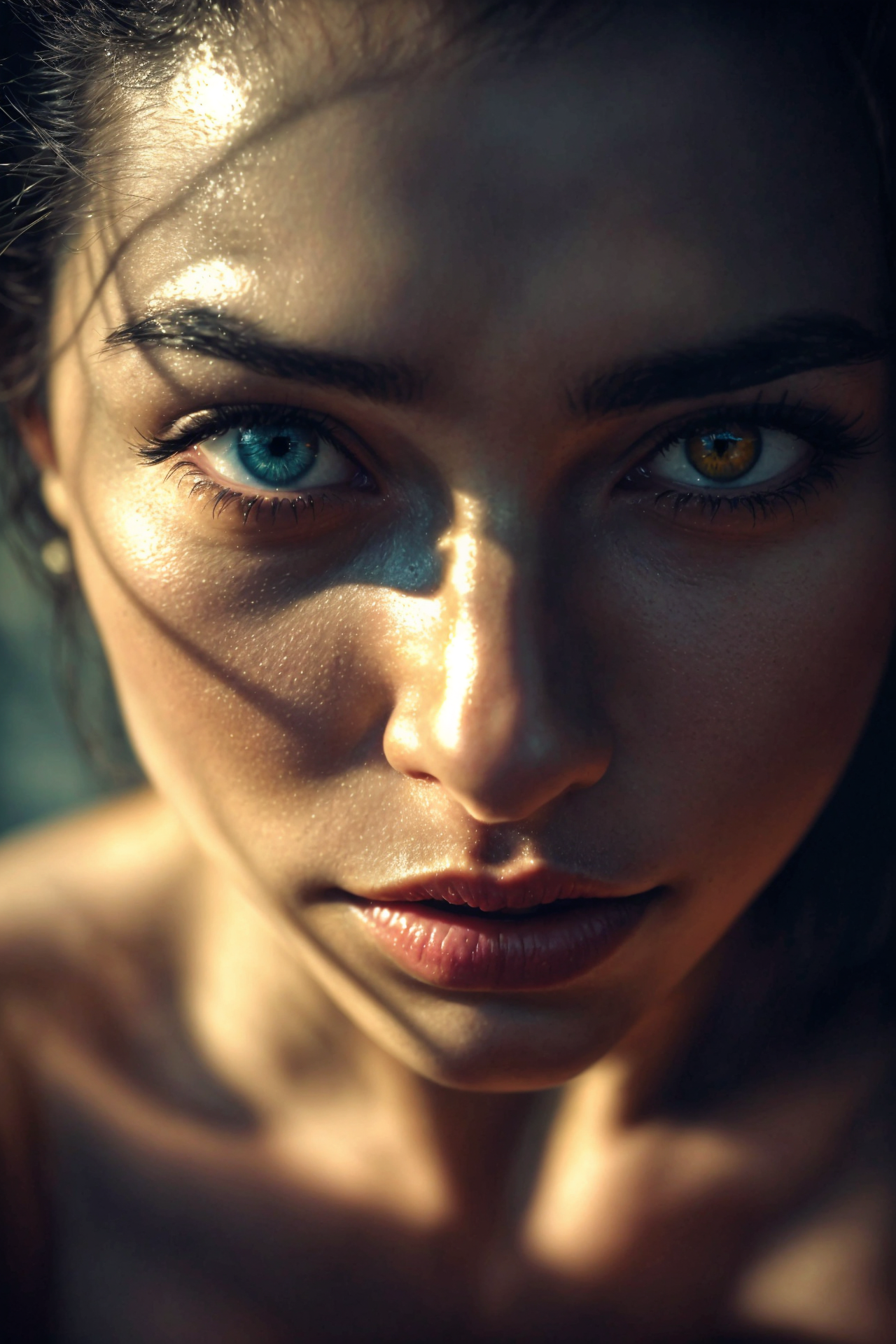 award winning professional photo, surreal upper body photo of a woman in a spectacular setting, ((split-tone lighting)), ((Zoom Blur effect)), (stunning eyes, one is amber and the other is blue), (detailed skin, skin pores, blemishes), ((dramatic shadow play), (cinematic lighting), shot on a Fujifilm X-T4 with a 50mm lens,