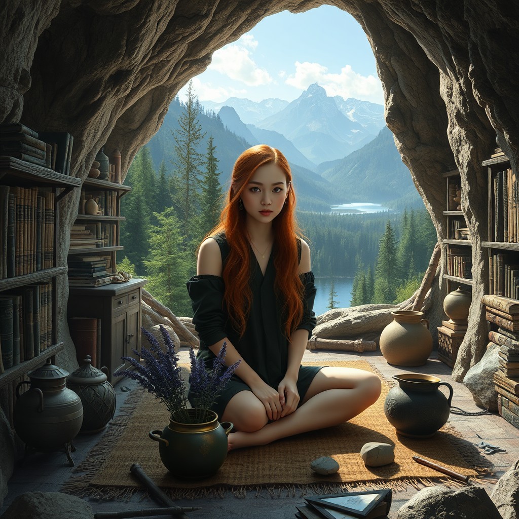 Surreal and imaginative digital artwork featuring a witches home set within a cave. The cave walls are lined with shelves filled with magical paraphernalia and books creating a magical atmosphere. The cave opening reveals a stunning view of forests mountains and lakes. In the centre of the scene, a woman with light skin and long copper hair, she has Asian features and is wearing a short black tunic, is sitting on a mat, her eyes alert. In front of her, there are various items including a pot with lavender, a small cauldron, and a few stones. The overall ambiance is mystical and tranquil with a gothic edge