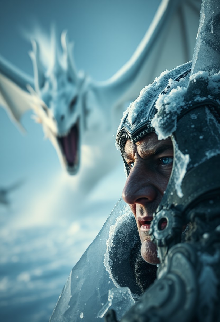 UHD 32k dark fantasy movie still, photograph, closeup scared warrior frozen solid in a block of ice with eyes open and teeth gritted, in the background a scary realistic white dragon is flying towards camera with mouth open, cone of snow and wind is coming from dragon's open mouth, blizzard, wind and snow, camera at interesting angle, sharp focus, studio photo, intricate details, highly detailed, sf, intricate artwork masterpiece, ominous, matte painting movie poster, golden ratio, trending on cgsociety, intricate, epic, trending on artstation, highly detailed, vibrant, production cinematic character render, ultra high quality model, close up portrait, film, studio lighting, detailed skin, ultra realistic, bokeh, sharp features