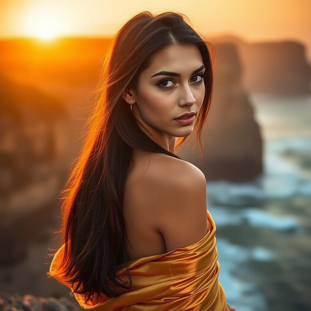 stunning young woman with long, flowing black hair stands near the edge of a cliff at sunset. The golden light from the setting sun casts a warm glow over her skin and hair, creating a radiant and ethereal effect. Her gaze is soft yet captivating, as she looks over her shoulder towards the viewer. The backdrop features dramatic cliffs and a rugged coastline, with waves crashing below. She is wrapped in a golden, shimmering fabric that drapes elegantly over her shoulder, enhancing her natural beauty and blending harmoniously with the sunset hues. --style raw --stylize 999 --v 6.0 --ar 3:4