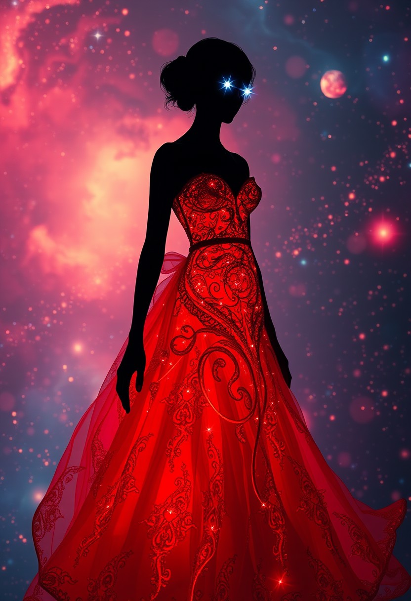In a mesmerizing, artistic image, a silhouetted figure stands against a vibrant, cosmic backdrop, its body outlined in intricate, swirling star patterns that seem to shimmer and dance in the light. The figure wears a stunning, bright red dress that appears to be made of a thousand tiny, glowing threads, each one pulsing with an inner light. The dress is rendered in exquisite detail, with delicate, lace-like patterns and subtle, textured folds that seem to ripple and flow like the surface of a lake. The figure's eyes glow with an otherworldly blue light, as if they're two tiny, shining stars that have been plucked from the cosmos and placed in the figure's head. The overall effect is one of mystical, dreamlike wonder, as if the figure is a celestial being who has descended from the stars to walk among mortals. The image is bathed in a soft, ethereal light, with subtle shading and texture that creates a sense of depth and dimensionality. Highest-Quality, 4k, intricate details, visually stunning, Masterpiece