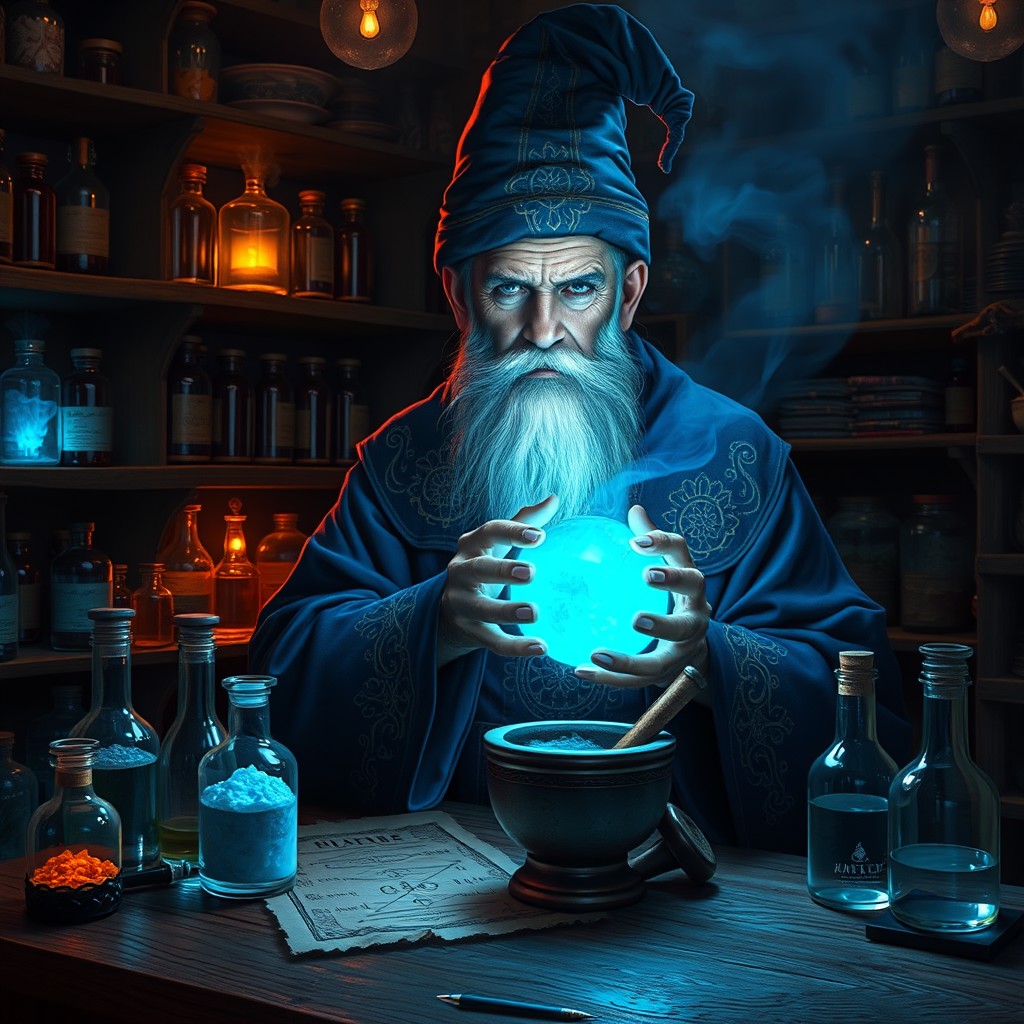 hi resolution, photorealistic digital artwork depicting an elderly wizard in a dimly lit, cluttered alchemist's workshop. The wizard, with a long white beard and stern expression, wears a blue robe adorned with intricate gold patterns and a matching pointed hat. His skin is light, and his eyes are intense, focused on a glowing blue potion he holds in a glass orb. The workshop is filled with shelves of various bottles and jars, some containing glowing substances. On the wooden table in front of him are more bottles, a mortar and pestle with a glowing blue substance, and a parchment with alchemical symbols. The overall atmosphere is mystical and magical, with a blue ethereal light illuminating the scene.
