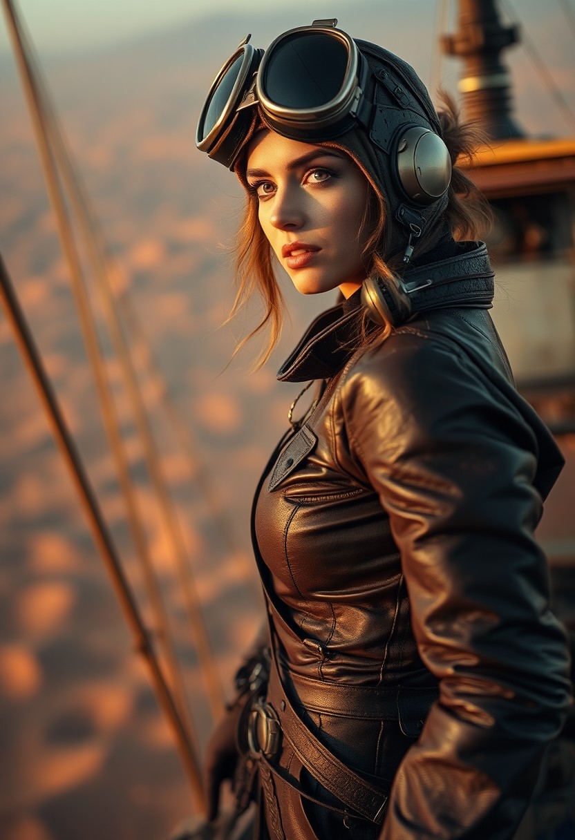 female captain standing on the flying ship, vintage pilot goggles, pilot leather outfit, steampunk, above desert, sandstorm, dawn, out of focus, extremely detailed, masterpiece