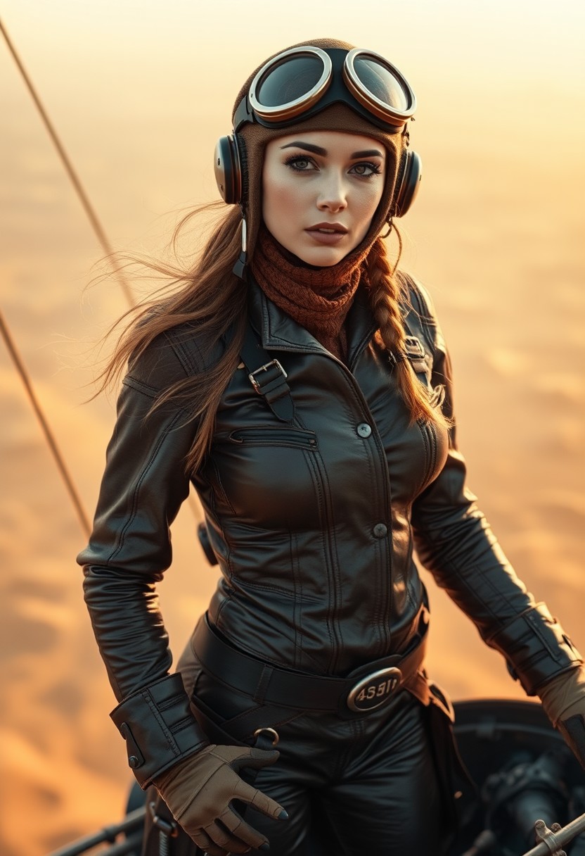female captain standing on the flying ship, vintage pilot goggles, pilot leather outfit, steampunk, above desert, sandstorm, dawn, out of focus, extremely detailed, masterpiece