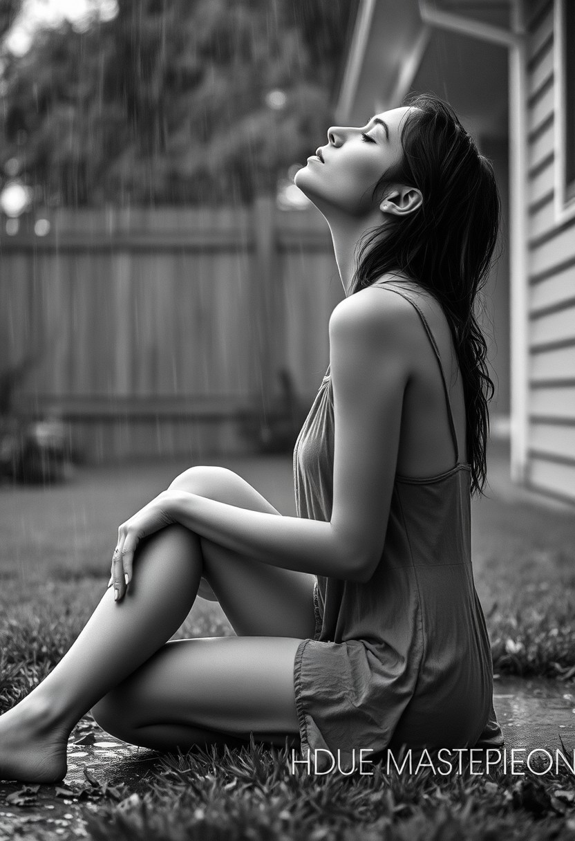 3/4 shot, black and white photograph, a woman, side view, sitting on the ground in her backyard during a rainstorm, raining, wearing sexy thin pajamas, wet hair, wet clothes, head tilted back, eyes closed, long exposure, masterpiece, UHD