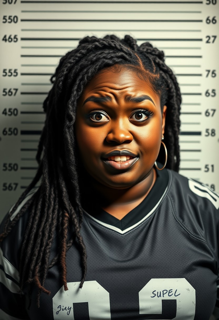 A striking and edgy digital artwork portraying a rebellious dark skinned fat female character during a police mugshot. The character is depicted with a scared and frightened demeanor. She stands against the typical height chart background found in police stations, with her height marked on the wall behind her. The setting is gritty and urban, enhancing the overall rebellious vibe of the image. She has soft, chubby features, emphasized by her long full hair styled in dreadlocks. Her chestnut eyes are bold and heavily lined with dark winged makeup, adding concern to her already apologetic expression. Her high cheekbones and defined jawline are highlighted by the shadowing, making her appearance even more striking. She has wide toothy smile. She is dressed in a torn Silver and Black football jersey, giving her an innocent girl next door aesthetic. The image is a perfect blend of punk, rebellion, and dark humor, encapsulating the character's defiant and fearless attitude