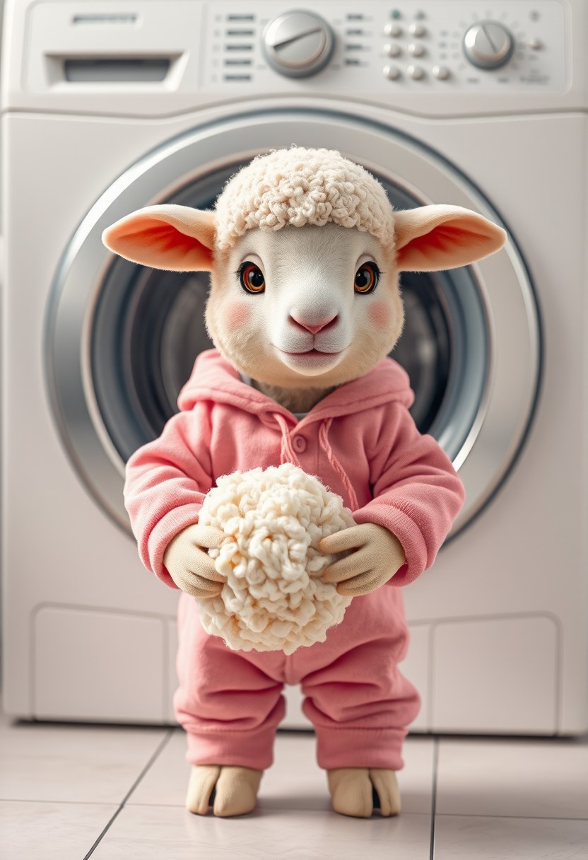 In a hyper-realistic image, an adorable little sheep wearing a pink onesie stands in front of a washing machine, holding its own wool in its front legs as if it's a complete outfit. The sheep's skin is rendered in exquisite detail, with delicate folds and creases that suggest a soft, gentle texture. The wool, which is normally a fluffy coat on the sheep's body, is instead held in a neat, compact bundle, with every strand perfectly aligned and groomed. The sheep's eyes are bright and curious, as if it's excited to wash its wool and make it clean and fresh. The washing machine behind the sheep is rendered in precise detail, with intricate buttons and dials that seem to be waiting for the sheep to start the cycle. The surrounding environment is a clean and tidy laundry room, with soft, pastel colors and a sense of domestic tranquility. The overall effect is one of charming, whimsical humor, as if the sheep is a fastidious and fashion-conscious creature that's determined to keep its wool clean and stylish. Highest-Quality, 4k, intricate details, visually stunning, Masterpiece
