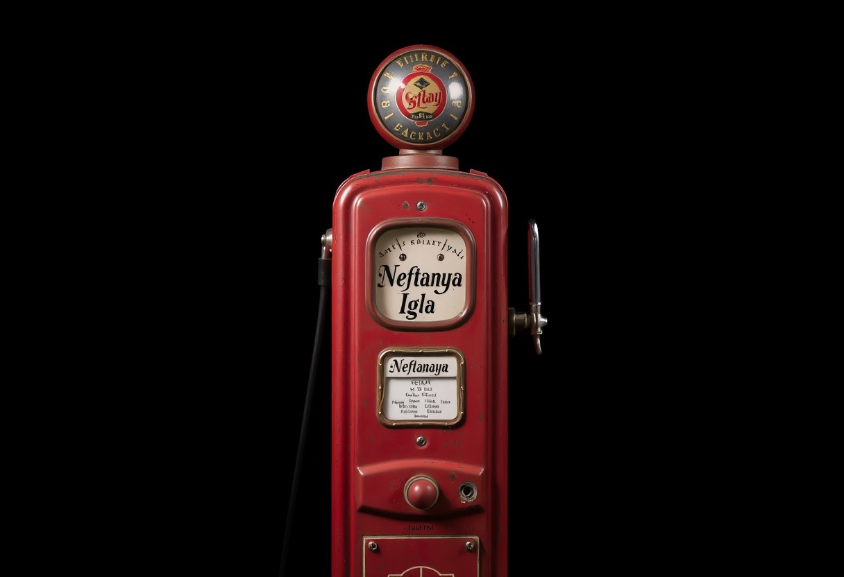 vintage old-school oil pump, black background, inscription on the machine "Neftanaya Igla"