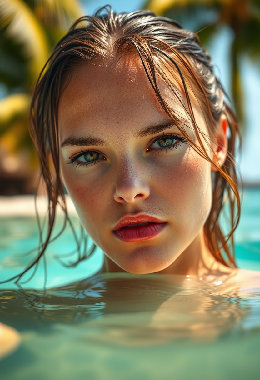 ultra-realistic image of a beautiful woman with wet hair in a tropical setting, partially submerged in clear, turquoise water. Her face is up close, with droplets of water on her skin, reflecting the sunlight. The background features soft-focus palm trees and bright, natural lighting. The mood is serene and captivating, emphasizing her expressive eyes and the fine details of her skin and hair. The image should have a cinematic quality, with warm tones and a summer vibe, capturing the essence of relaxation in an exotic beach environment