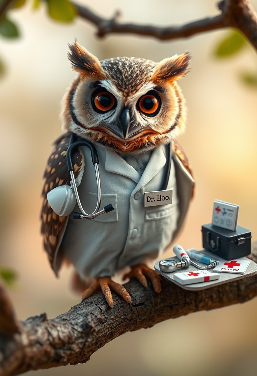 In a hyper-realistic image, an adorable little owl perches on a branch, wearing a miniature doctor's uniform that covers its body completely. The uniform is rendered in exquisite detail, with intricate stitching and creases that suggest a crisp, freshly laundered fabric. The owl's face is the only visible part of its body, with big, round eyes that are bright and curious. A miniature stethoscope is wrapped around the owl's neck, with the earpieces perfectly positioned to listen to a heartbeat. On the owl's chest, a tiny name tag reads "Dr. Hoo" in bold, black letters. Beside the owl, a small table is cluttered with various medical supplies, including a miniature thermometer, a blood pressure cuff, and a tiny first-aid kit. The surrounding environment is a cozy, natural setting, with soft, muted colors and a sense of peaceful tranquility. The branch the owl is perched on is rendered in precise detail, with intricate textures and patterns that suggest a living, breathing tree. Highest-Quality, 4k, intricate details, visually stunning, Masterpiece