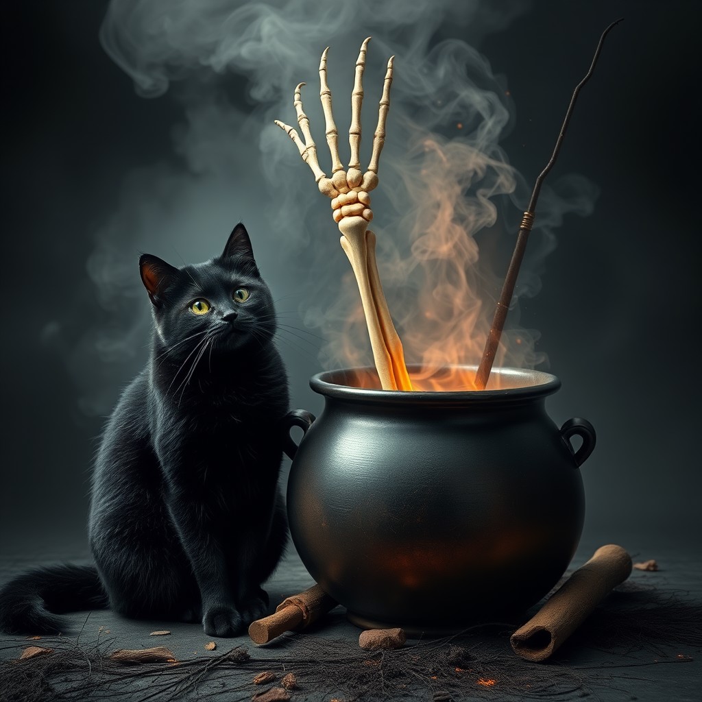 solid black american shorthair cat sitting by a witch's cauldron that has been left unattended. a skeleton hand bones are rising up out of the cauldron surrounded by smoke and sparks of fire