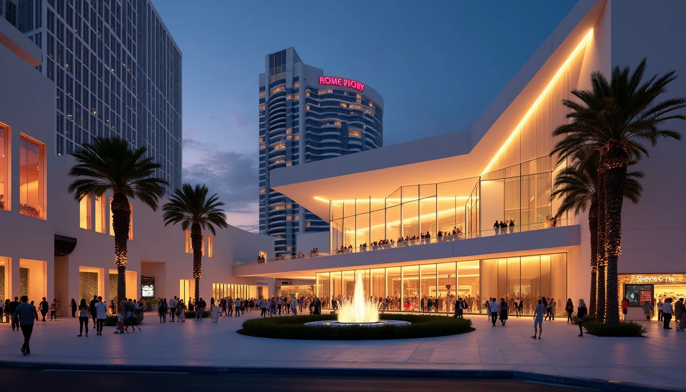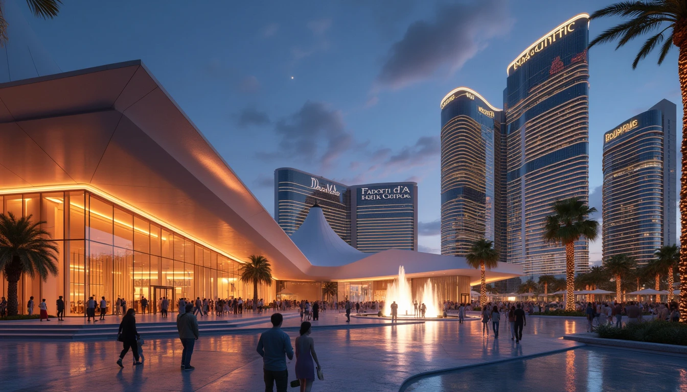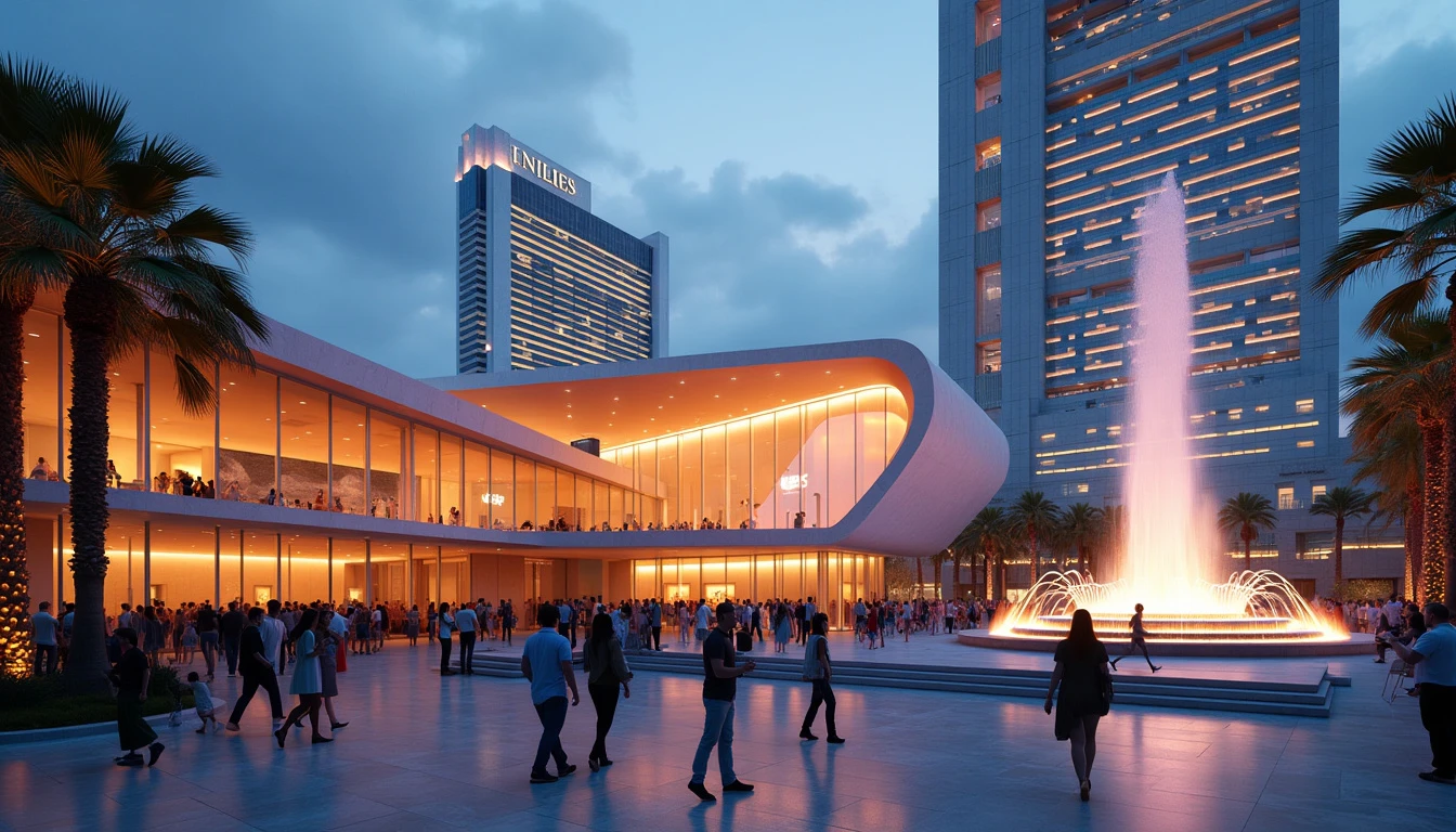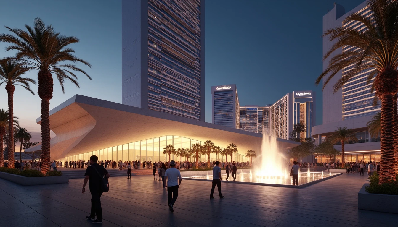 Photorealistic exterior of a digital concert venue in Las Vegas. The style angular and also modern interpretation of Italian Rationalist. In the background are tall modern casino and hotels, which are connected in the back to this venue. It is nightime. There is a medium-sized excited crowd walking around. There is no text on any of the buildings. Juxtaposition of light and glass. Bauhaus. Cantilevered, horizontal design emphasis. Lots of palm trees are in view as well as an interesting fountain.