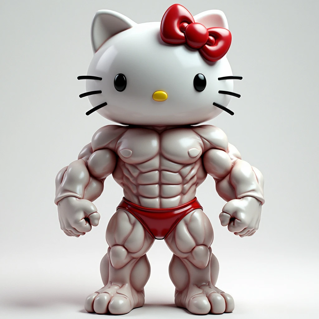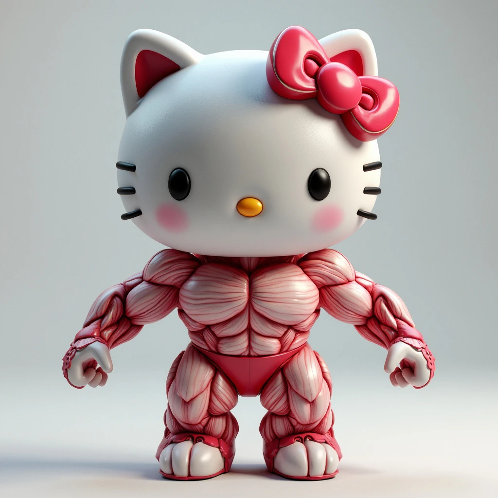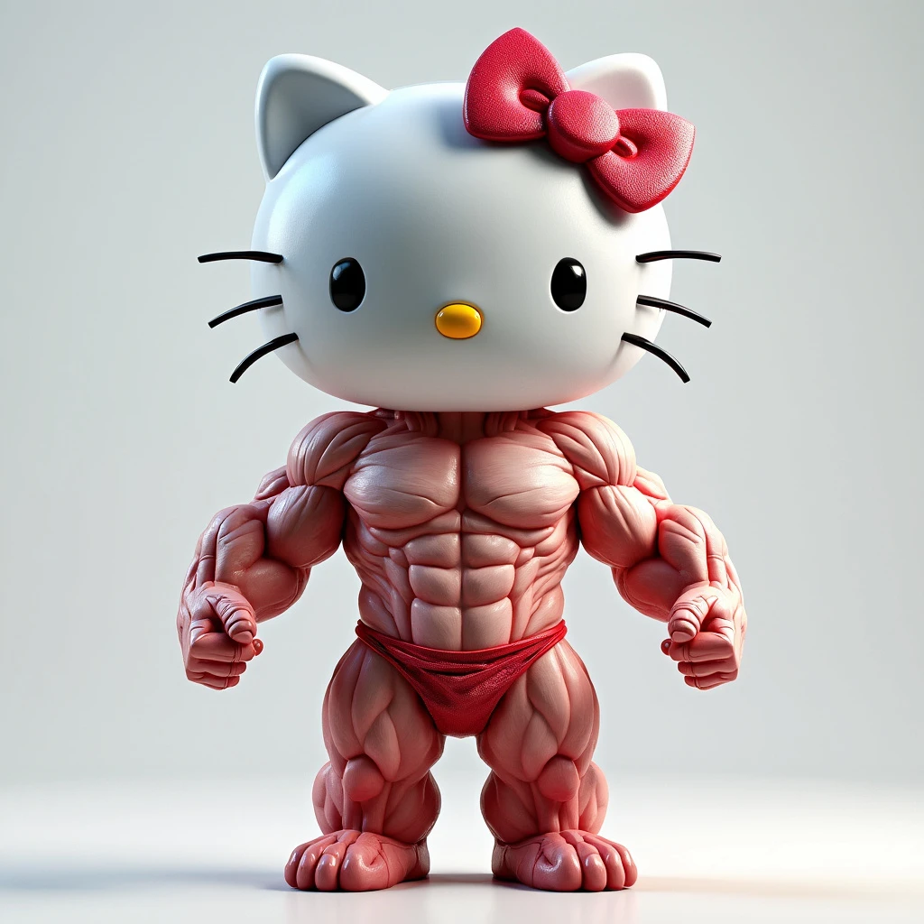 A 3D render of a bodybuilder Hello Kitty character, with highly defined and exaggerated muscles, showcasing a heavily muscular, anabolic physique. The character retains the iconic Hello Kitty features such as the bow on her head, simple facial expression, and white fur. The muscular definition is hyper-realistic, highlighting veins, muscular striations, and anatomical accuracy. The render is created using Octane Render and Unreal Engine 5 for ultra-high quality, realistic textures, and lighting. The scene is brightly lit, with dramatic shadows to emphasize the muscle definition and create a powerful, imposing look. The background is blank white.