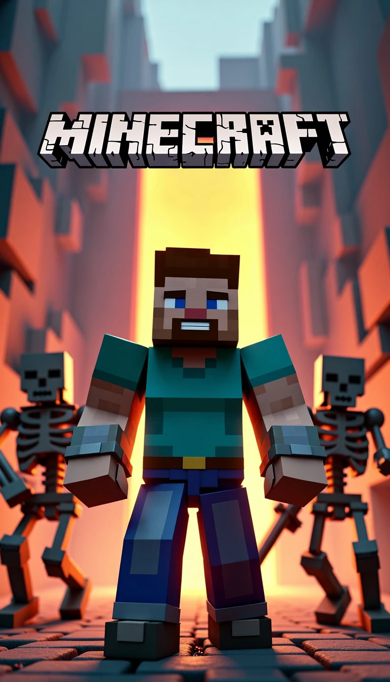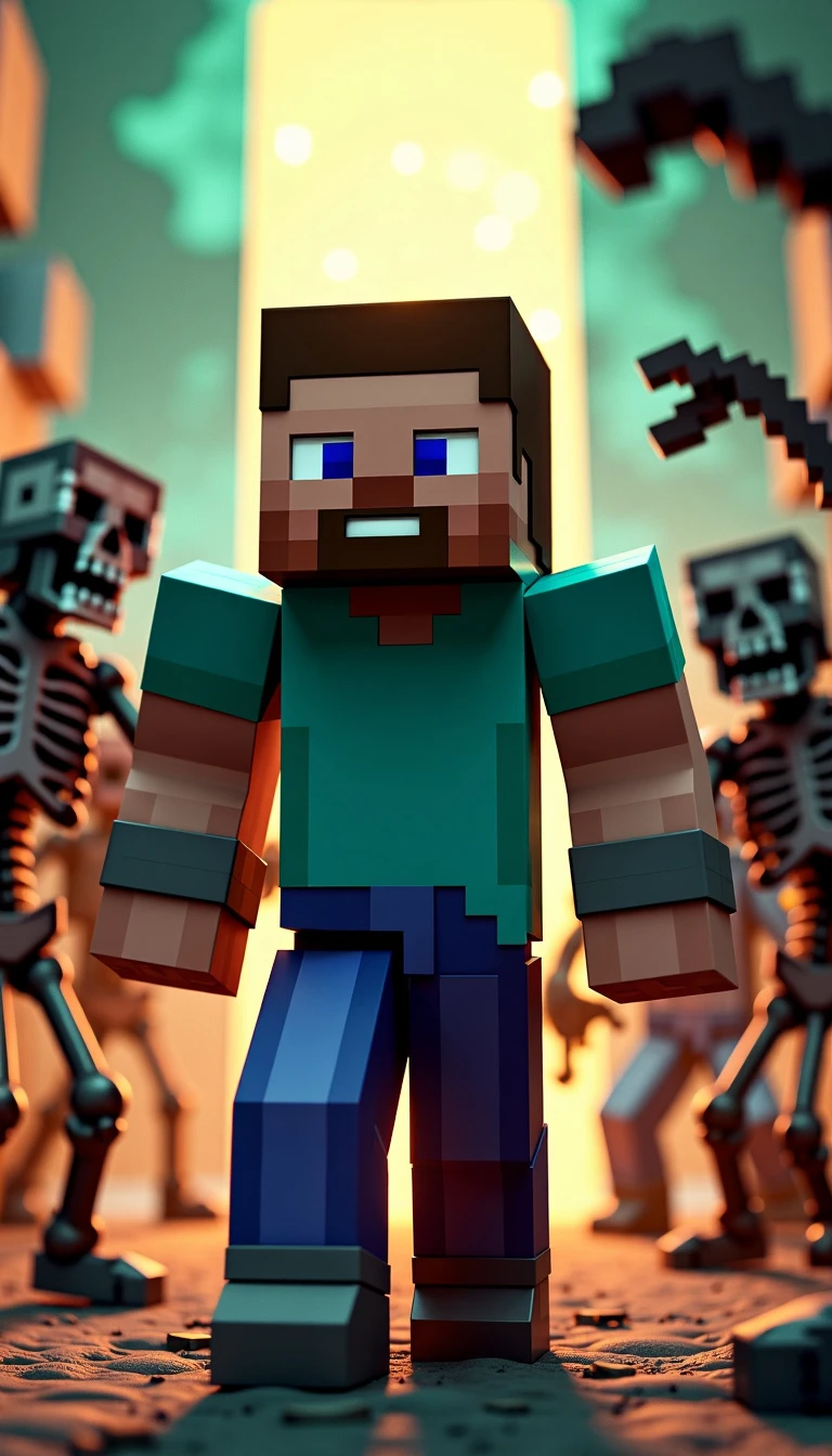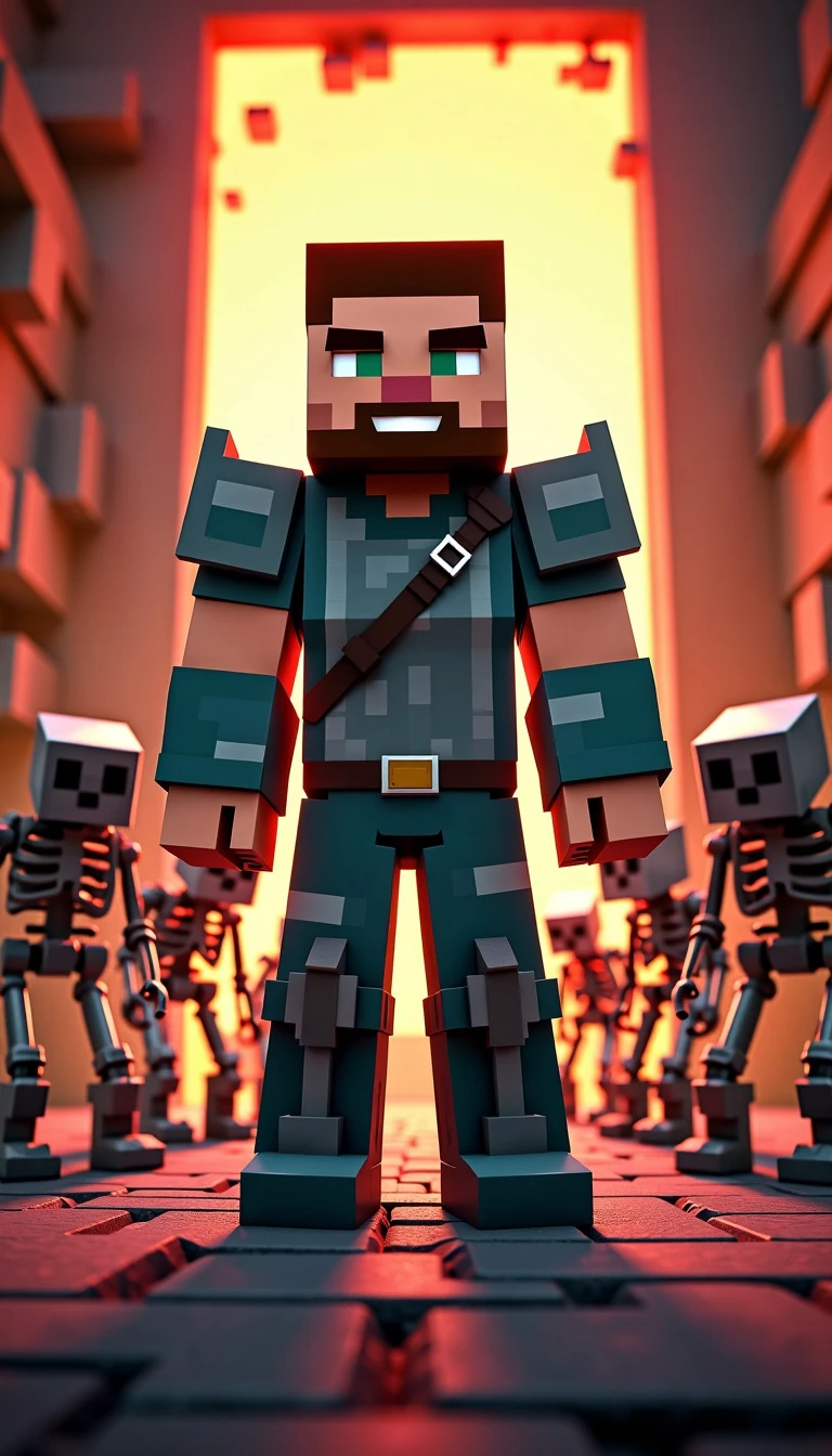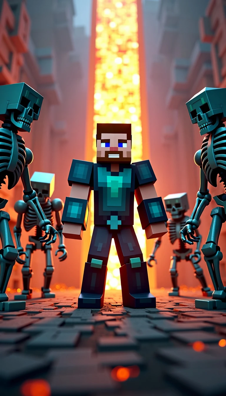 Photographic image, hyperrealistic, muted colors, highlighted shadows, volumetric lighting, microscopic details, 8k, perspective with 3 vanishing points. A realistic live-action style movie poster for Minecraft, featuring a muscular Steve with a beard and mustache, smiling confidently while wearing full diamond armor. He is surrounded by hostile skeletons and other Minecraft mobs, all aiming to attack him. Behind them, a glowing Nether portal is active, and the background blends the Overworld, Nether, and End biomes. Steve stands tall in the center, grinning, as if unfazed by the danger, making the scene feel intense and action-packed. The title 'Minecraft' appears in large, bold letters in the center with a cinematic flair.