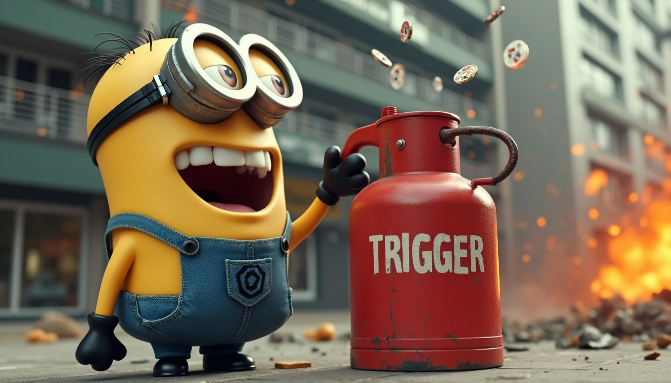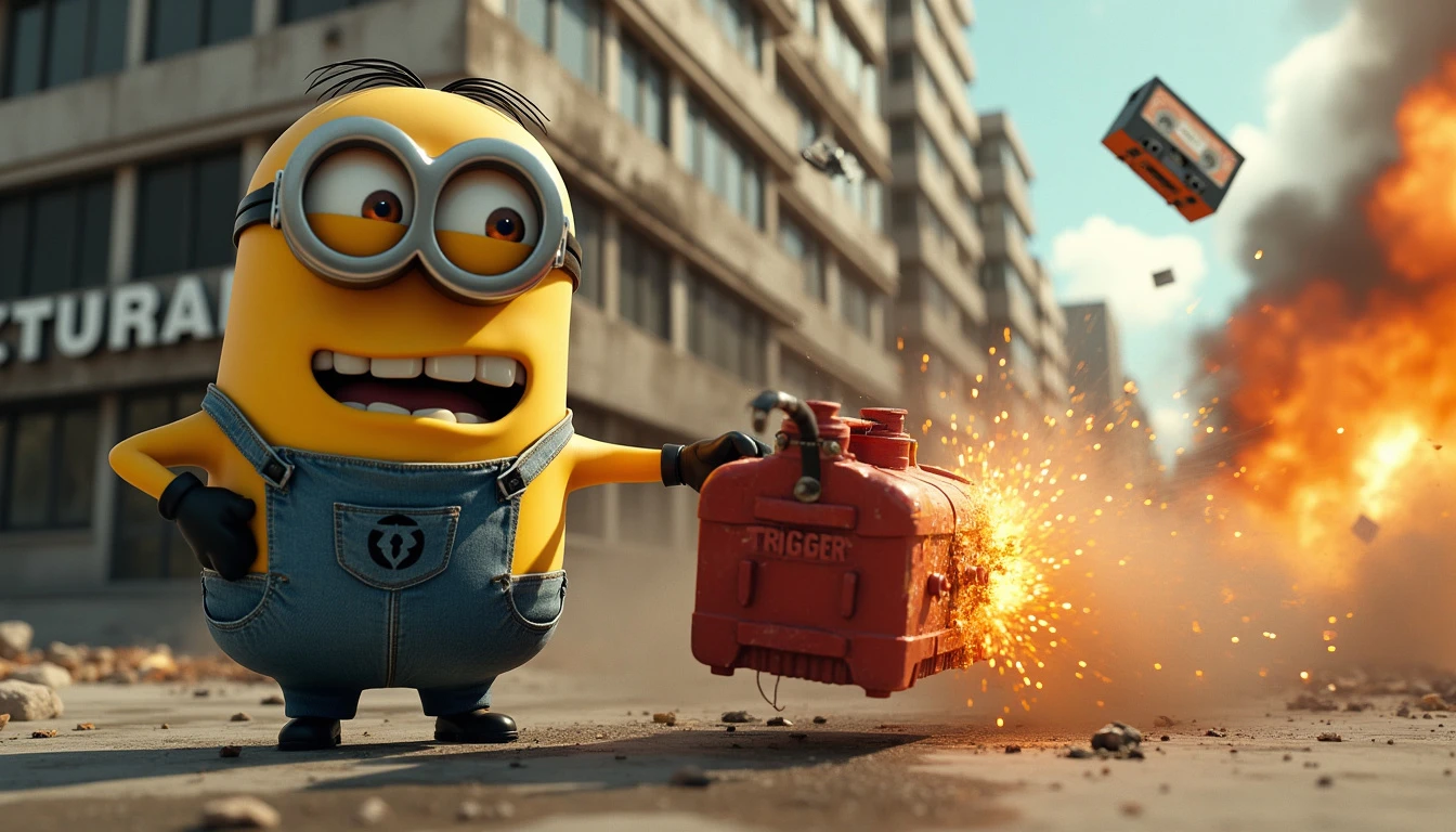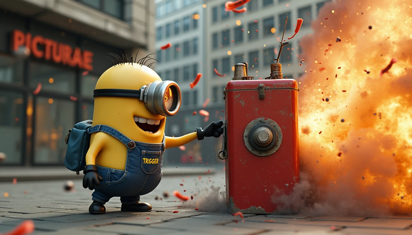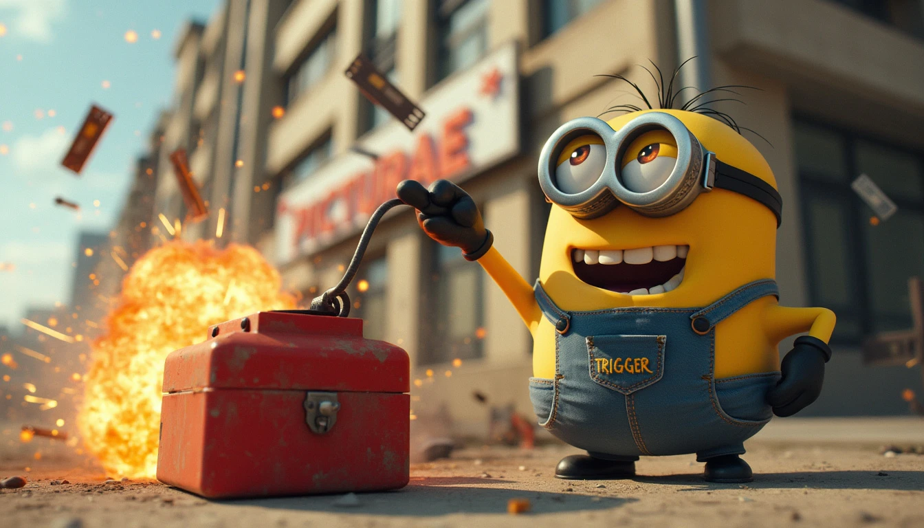 a minion pushes down a handle of a red bomb detonator box. he laughs and looks mean. on the minion's pants the text "TRIGGER" is embroidered. a part of an office building behind him explodes. a lot of fire, sparks and smoke from the building. on the facade of the office building a large sign with the text "PICTURAE". the text is easy to read. sharp, high detail. audio tape reels fly through the explosion in the air.