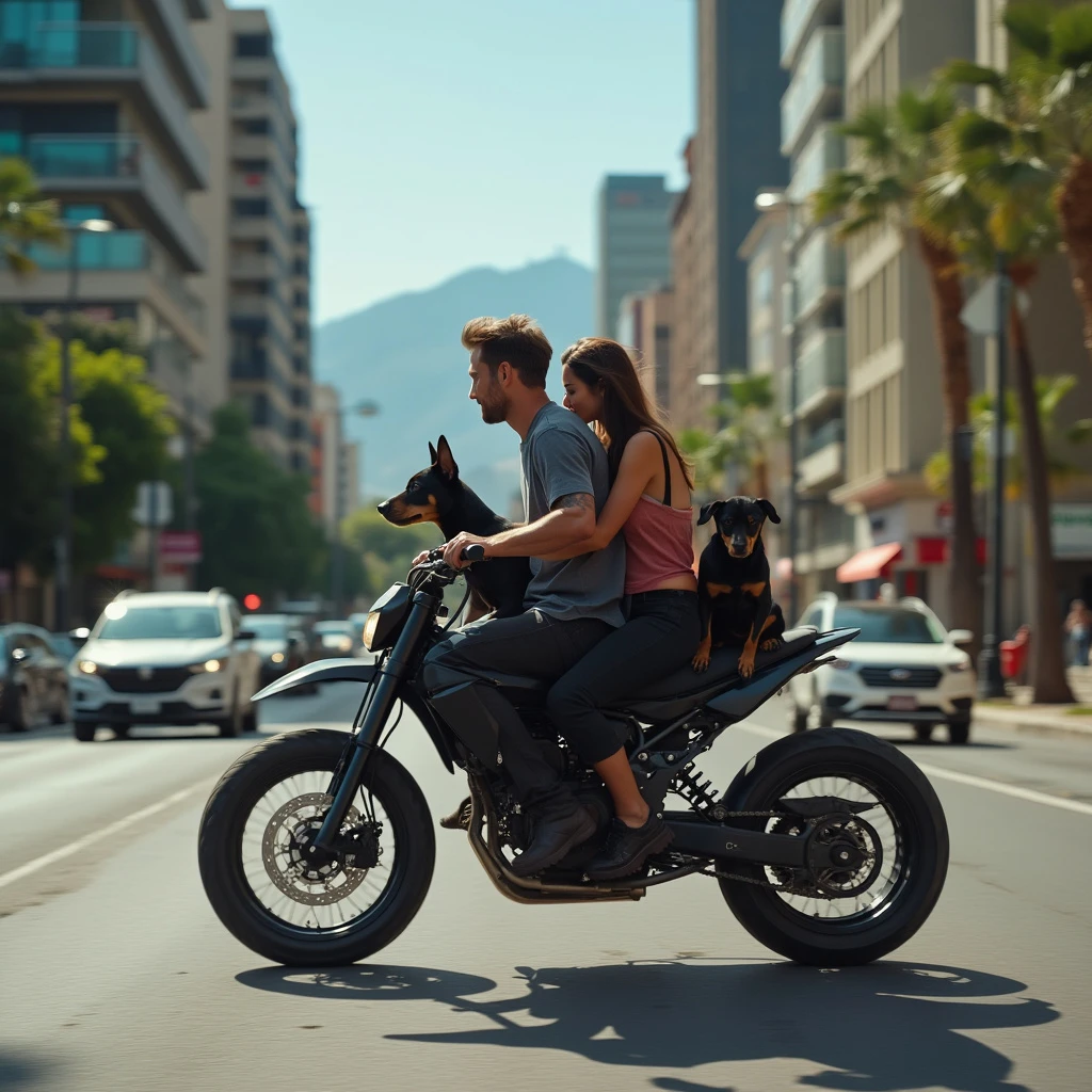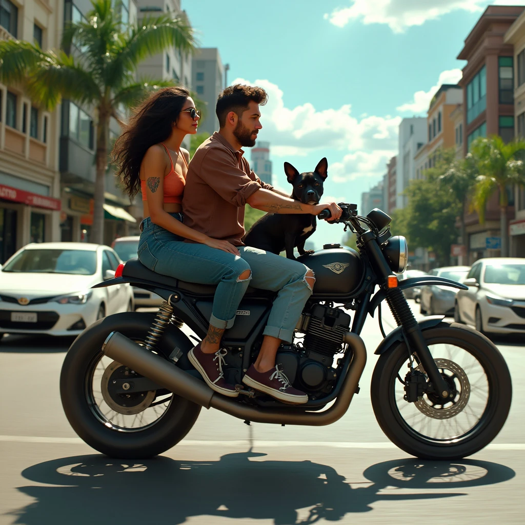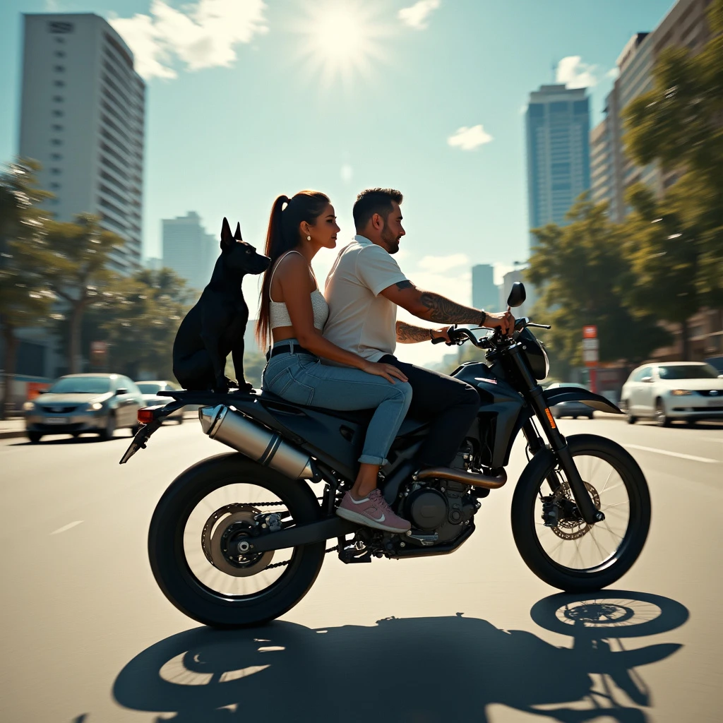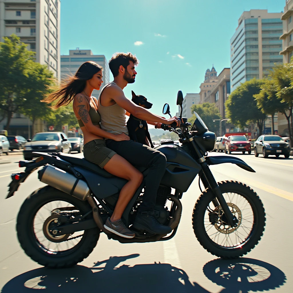 realistic photo of the side view of a couple driving on a black enduro-style motorbike through the city of Medellín, the female is latina, small, with brown skin with tattoos, the male is a Caucasian white male - he is a little bigger then the female, they have a little black pinscher dog sitting between them, Medellín is a Latin-American city with a lot of traffic and trees, blue sky, sun is shining