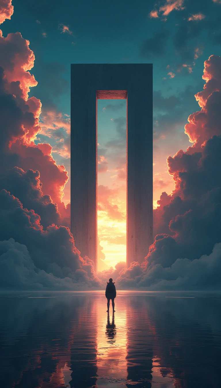 Create an image featuring a towering, vertical rectangular portal that opens to a dramatic sky filled with tumultuous clouds and intense, fiery light. In the foreground, include a solitary silhouette of an individual standing before the portal on a reflective water surface that mirrors the scene, ghibli style, modern anime style, 4k