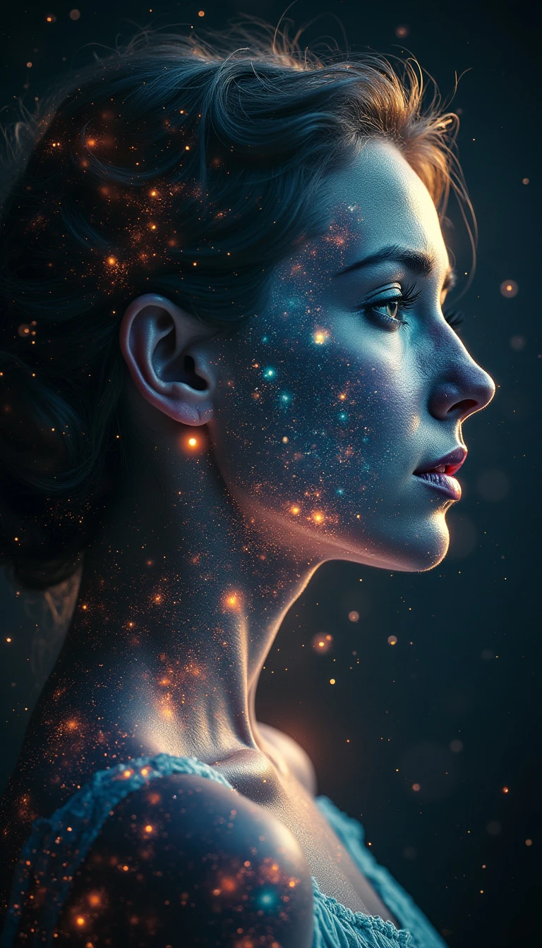 a woman's silhouette, double exposure, iridescent nebula galaxy, black background, ethereal glow, bloom, hdr