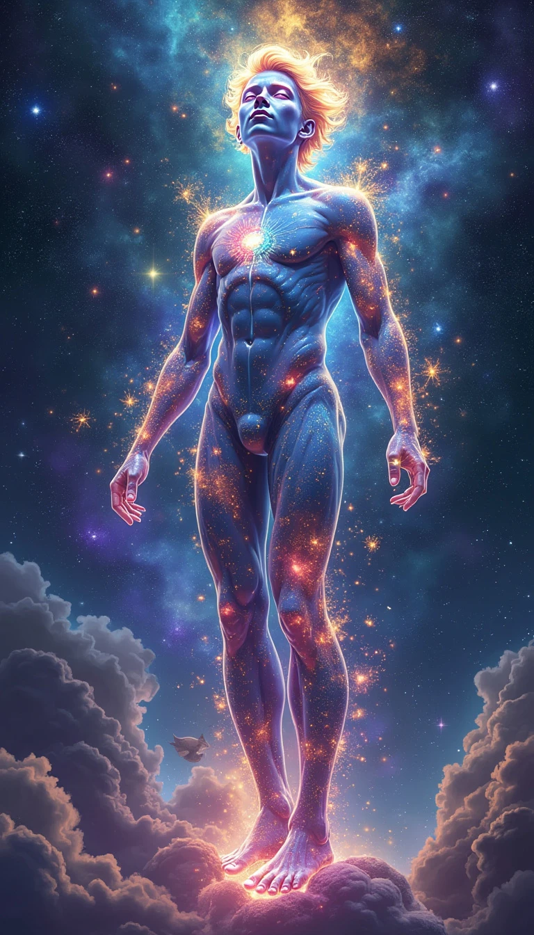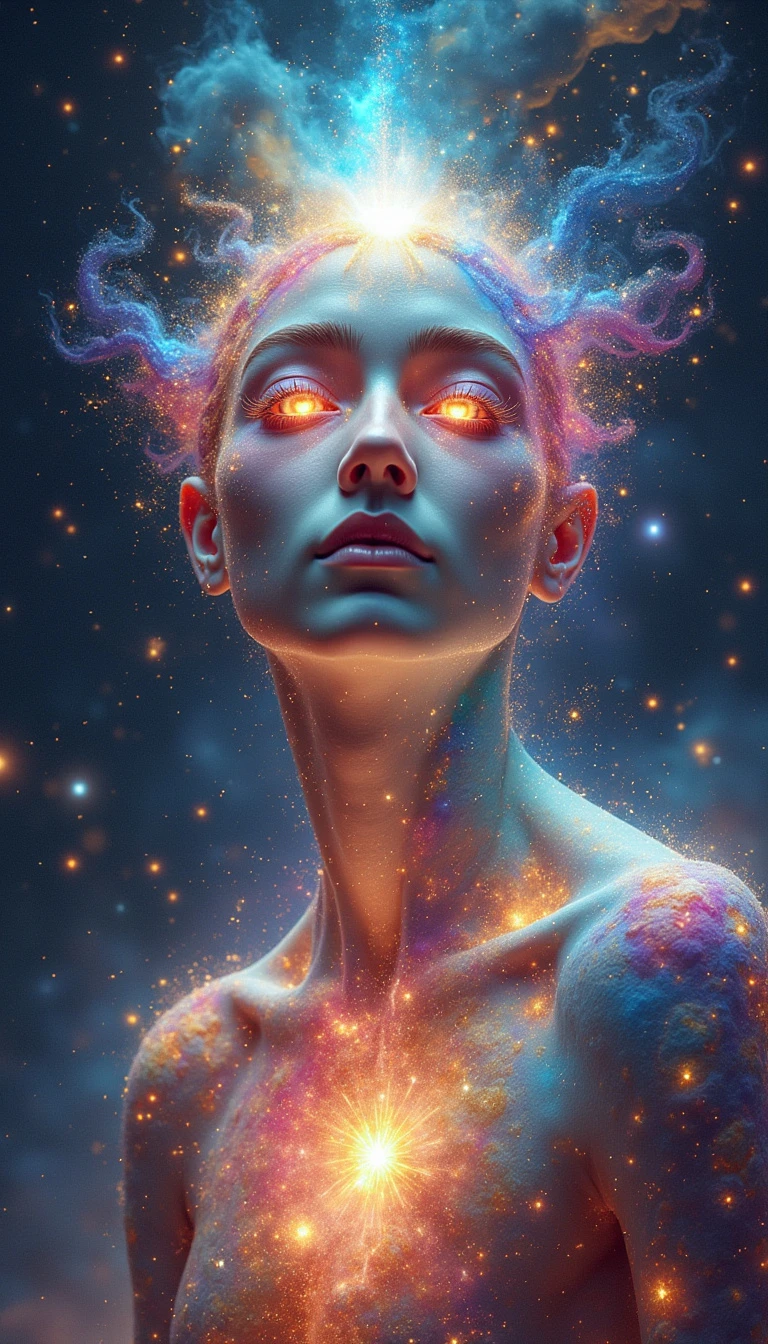 A cosmic figure of nebulas and galaxies . The figure's face is illuminated with a cosmic radiance , expression is reflective . The celestial body is adorned with interdimensional portals and various colors , creating an intricate and captivating display. Galaxy, Anime, Full Body, centered