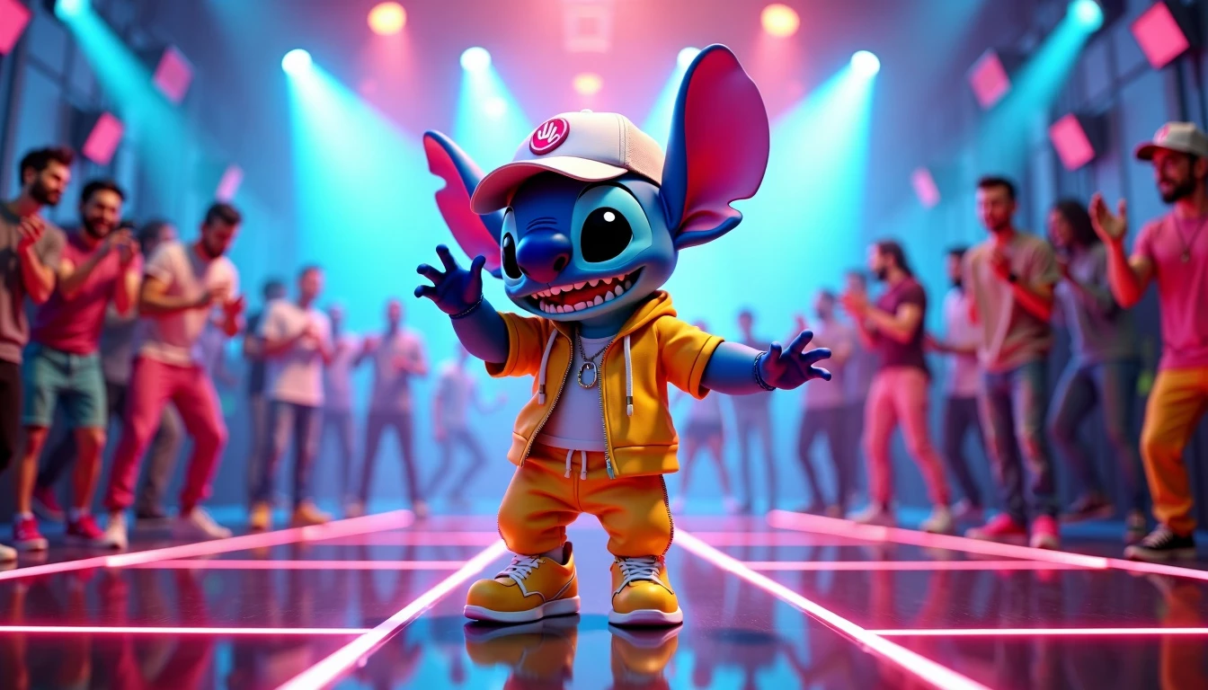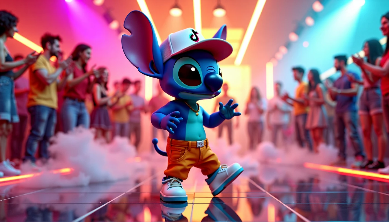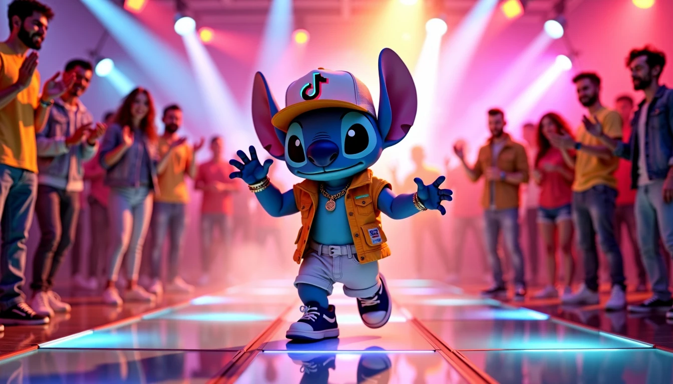 "Create a 4K, 8K ultra-high detail 3D render of **Stitch**, dressed in bright **urban clothing**, featuring a **white trucker hat with a TikTok logo**. He stands in the center of a vibrant club, surrounded by **colorful lights and smoke effects**. The **glass dance floor** reflects his energetic dance moves, and the crowd is gathered around him, cheering and clapping as he performs. The club is alive with neon lights, and beams of light cut through the smoke, creating an electric atmosphere. **Stitch** is the center of attention, showing off his dance skills, while everyone around him celebrates and watches in awe. Wide angle shot side way