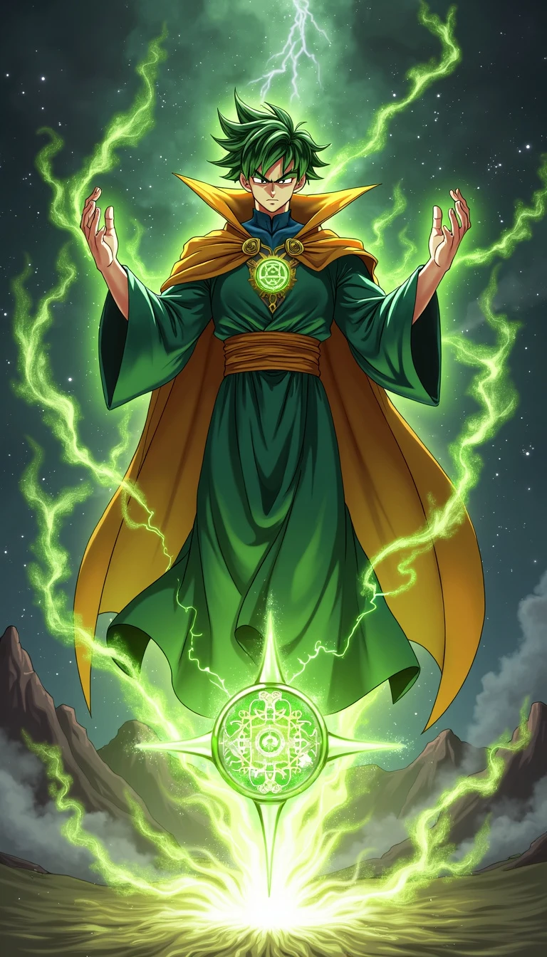 Piccolo + Doctor Strange fusion "A mystical fusion of Piccolo and Doctor Strange, floating in a meditative pose with swirling magical runes and Namekian energy around him. His robe is a blend of Piccolo’s cape and Doctor Strange’s Cloak of Levitation, with a mystical Dragon Ball symbol hovering in front of him. His hands are raised, performing a spell that opens a portal to another dimension, glowing with radiant light."