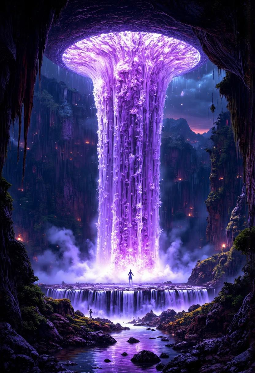 A hyper-realistic portrait, an epic scenery, alien planet surface, murky reflective waters, wet ground with piles of mucus, absolutely massive waterfall gigantic waterfall of purple water, huge contrasts separets the purple crystal waters from the beautiful night skies on alien planet, deep dark skies whole picture is covered in steam from dreamlike purple waters of that huge waterfall, crystall that radiating with bright glow on the surface, intricate ornate crystals, crystal clear water, detailed, smooth, sharp