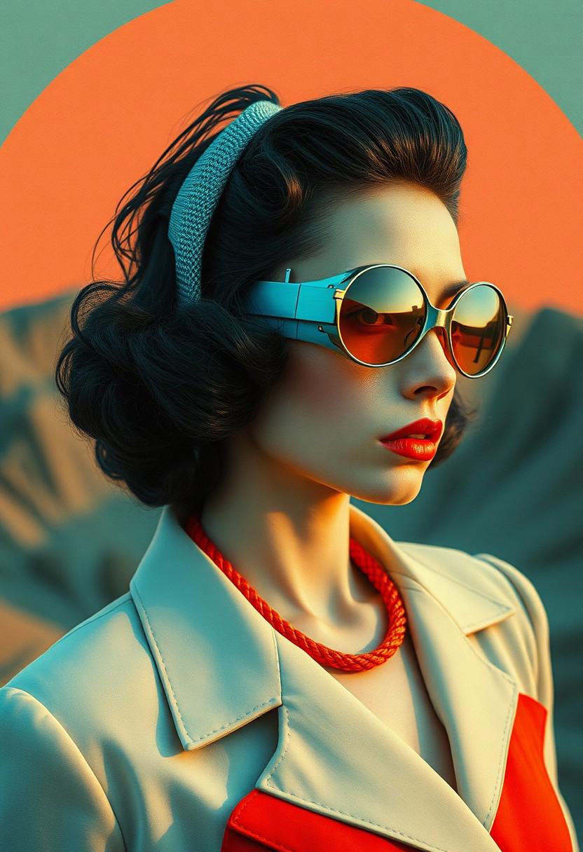 ArsMJStyle, ArtDecoVintageFuture, Traditional Media, Art Deco, portrait in art deco poster style of A striking abstract fashion shoot featuring a beautiful supermodel in weird clothes, weird locations, weird poses, weird make up