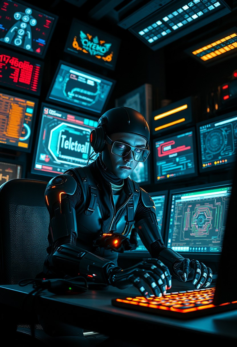 A cyberpunk cyborg hacker sitting in a dark, high-tech room filled with screens and holographic interfaces. The cyborg's fingers are equipped with data jacks and glowing cybernetic enhancements, working on a complex digital heist. The room is illuminated by the glow of multiple monitors