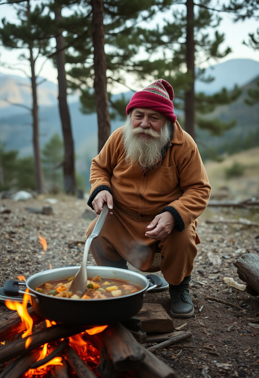 real photo medium format film photo portra 400 full body shot Habib "Hearty" Harthmut a Lebanese Arab dwarf preparing a hearty stew over a campfire in the woods, mountains in the distance,