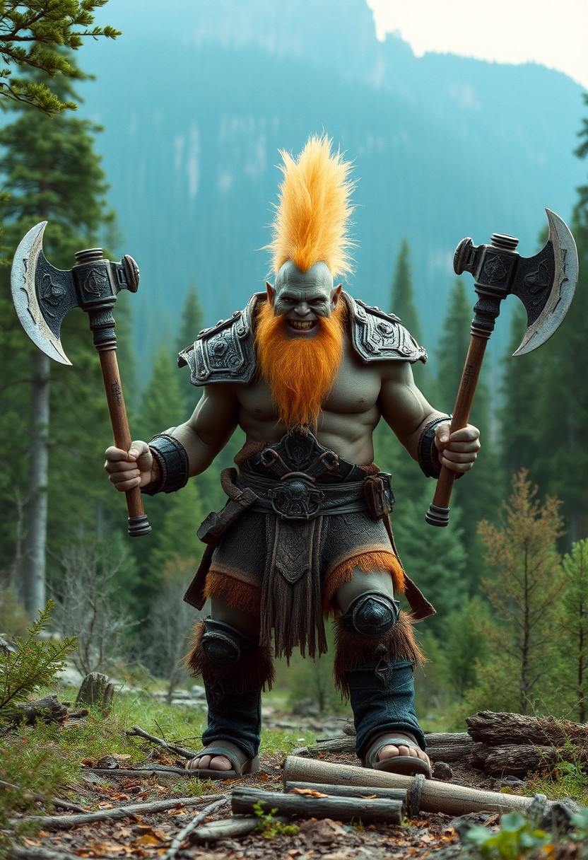 weta workshop real photo medium format film photo portra 400 full body shot huge happy orc warrior standing in the woods with a huge golden Mohawk wielding duel battleaxes, mountain range, where strength was the only currency that mattered. From an early age, Rogath was convinced he was destined for greatness. Towering over his peers even as a child, he believed his golden Mohawk was a sign that he was touched by the gods and would one day become one himself.