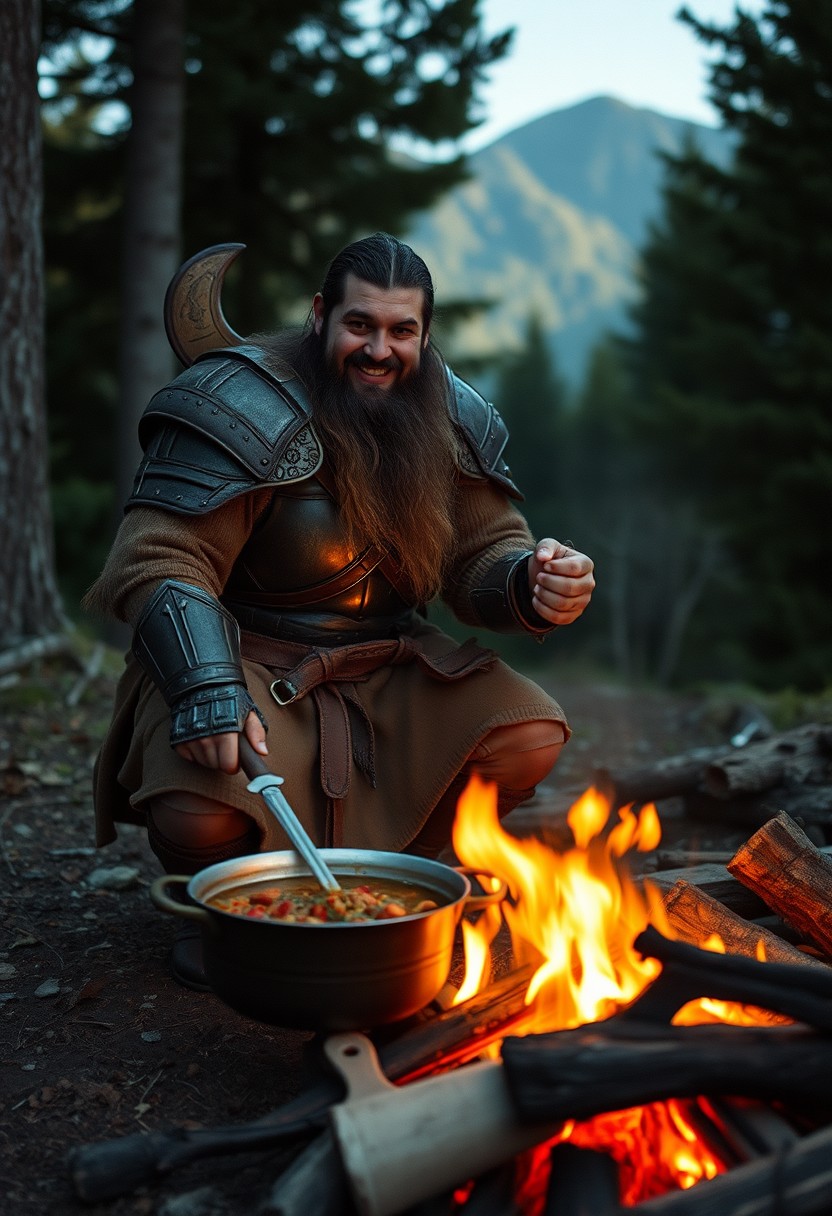 real photo medium format film photo portra 400 full body shot Habib "Hearty" Harthmut a happy Lebanese Arab Tolkien style dwarf armored warrior preparing a hearty stew over a campfire in the woods, mountains in the distance, masterpiece soft light